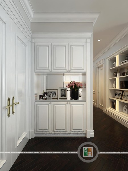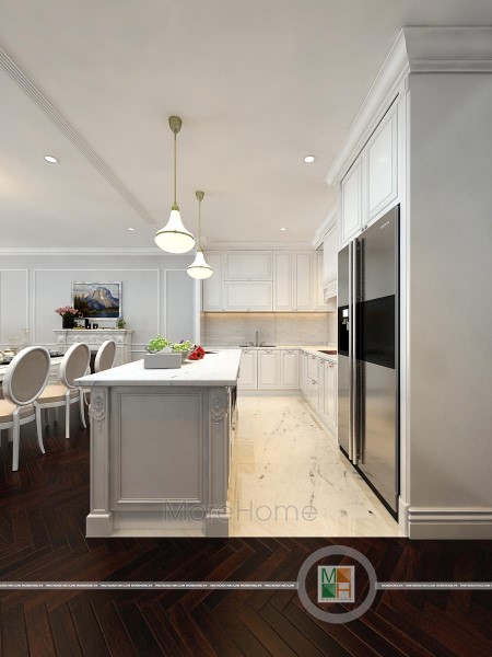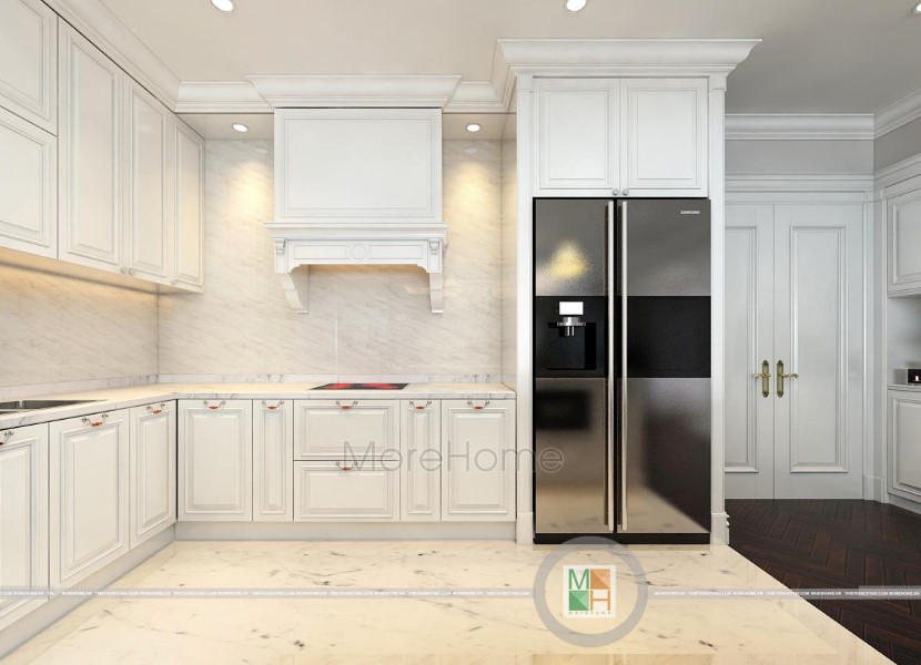 Tủ bếp tân cổ điển tại Imperia Garden mang tone màu trắng tinh khôi. Thiết kế tủ bếp chữ U quây gọn gàng thành một không gian riêng biệt đảm bảo tính rõ ràng trong thiết kế. Tủ bếp mang phong cách tân cổ điển nhưng không quá cầu kỳ, được thiết kế đơn sắc với các nét trạm khắc tinh tế vừa đảm bảo không gian mở công năng lại vừa tạo sự nhất quán trong thiết kế tân cổ điển.