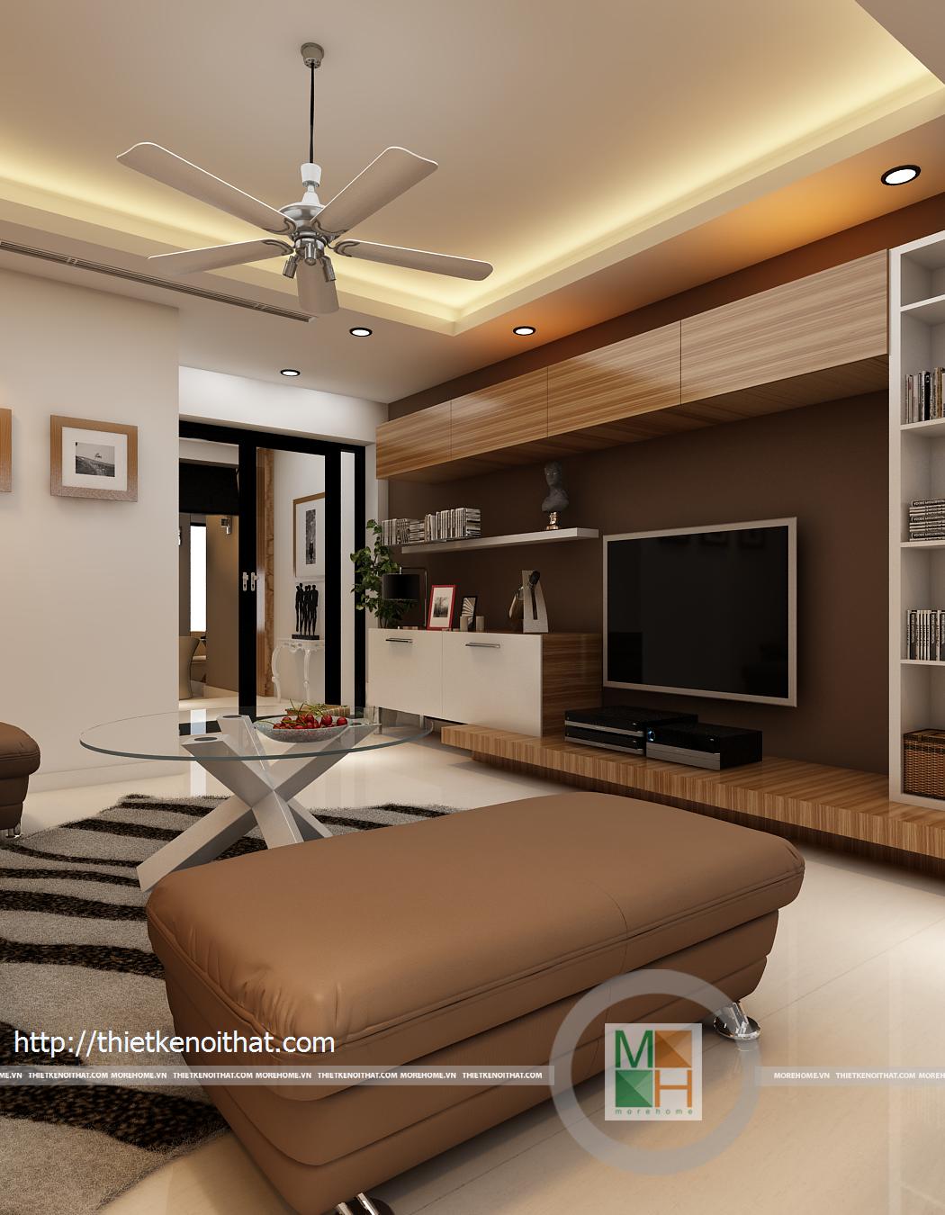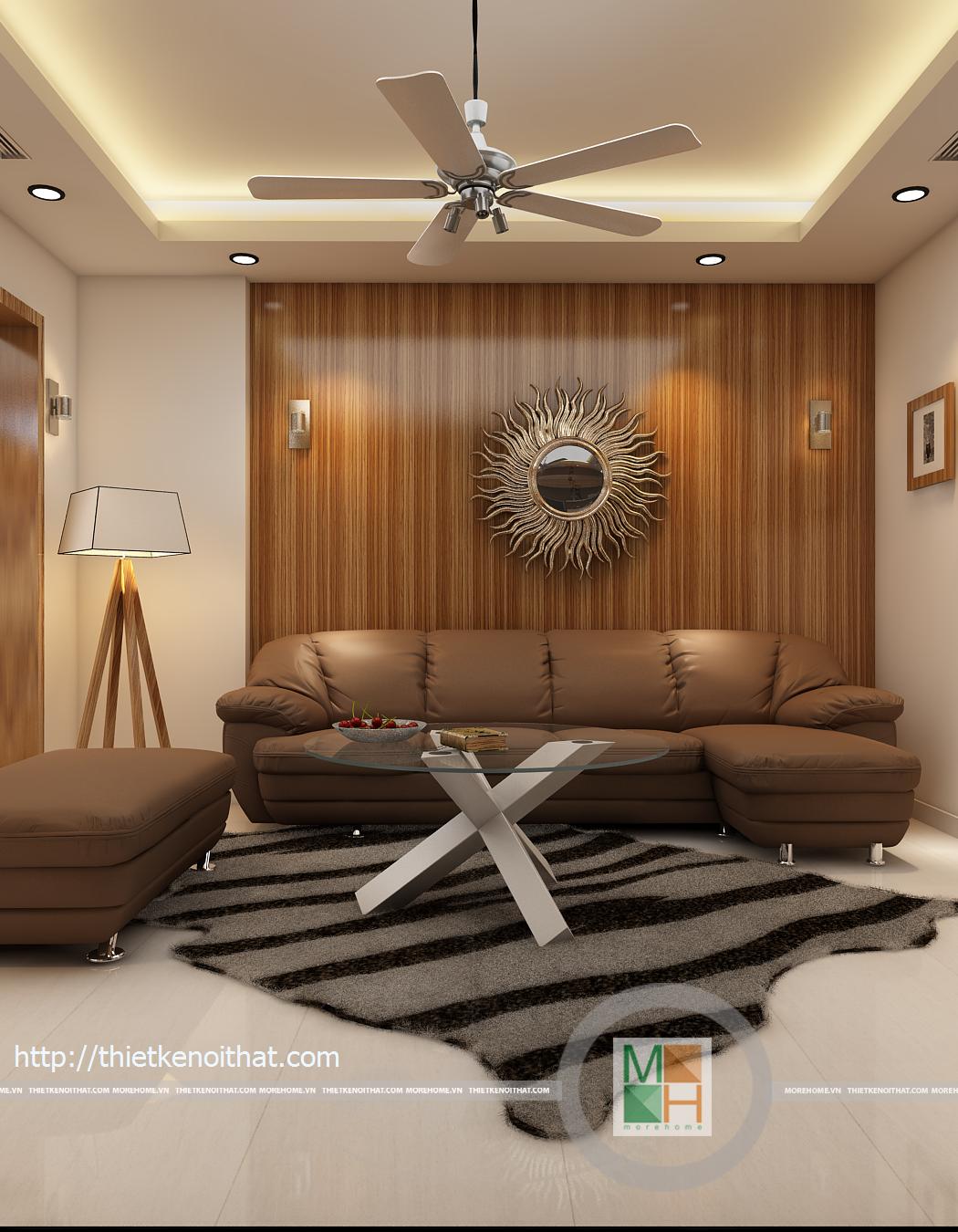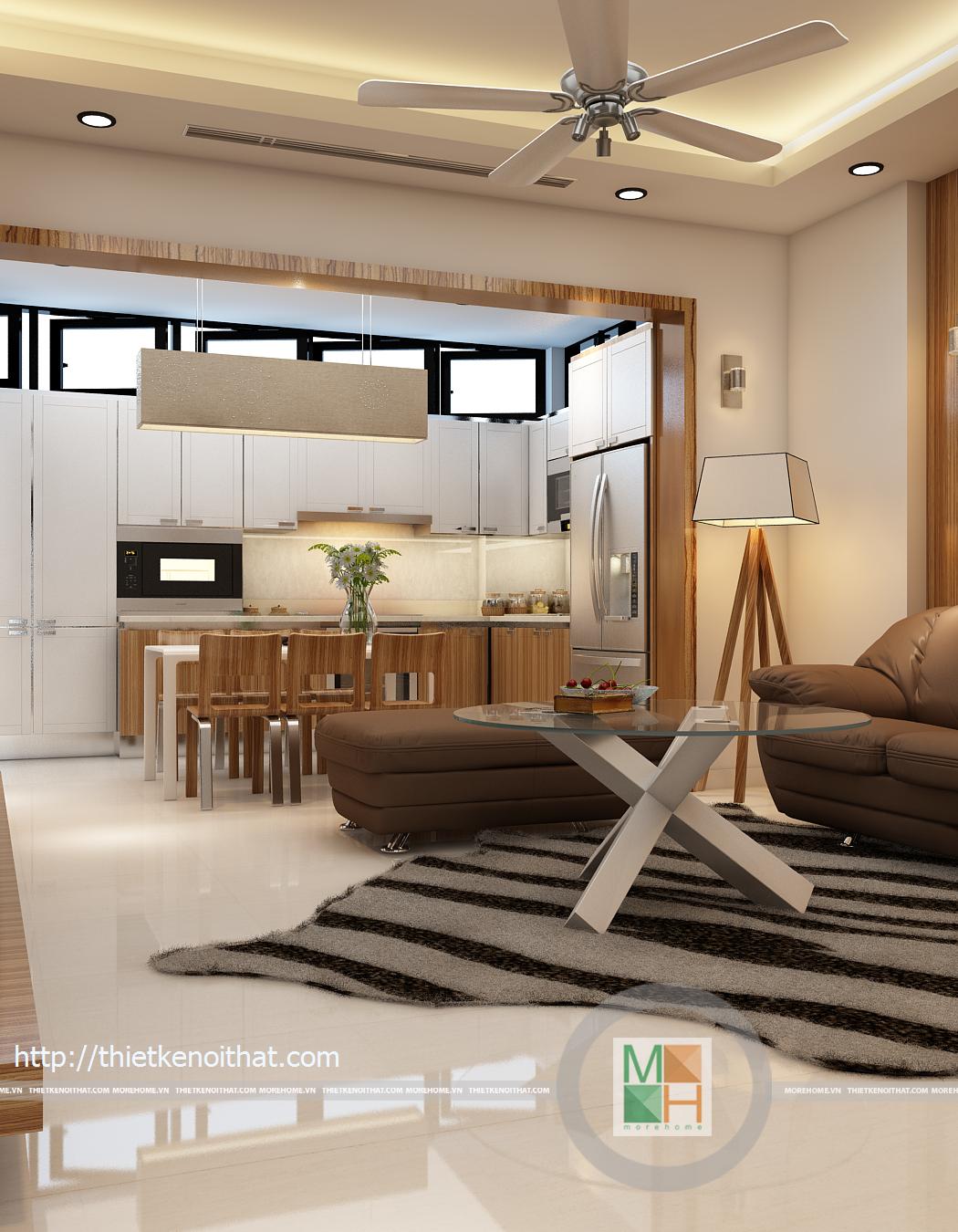 Phòng khách, bàn ăn và bếp được đặt ở dưới tầng một nhằm tạo sự gắn bó giữa các thành viên trong gia đình khi sinh hoạt. Điểm nhấn tại phòng khách là mảng tường gỗ đằng sau tivi. Bộ sofa có cùng tone màu nâu giống như bức tường tạo chiều sâu cho căn phòng. Ánh sáng màu vàng từ những chiếc đèn downlight khiến căn phòng có không khí ấm áp hơn. Chiếc thảm kê giữa phòng có tác dụng phân vùng không gian với bàn ăn và khiến căn phòng trông sang trọng hơn.