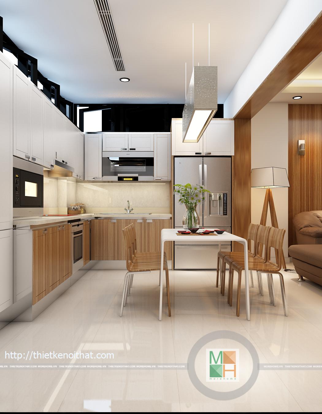 Bàn ăn được tối giản để phù hợp với diện tích nhà nhưng không vì thế mà mất đi tính thẩm mỹ. Sự kết hợp giữa phần gỗ ở trên và inox ở dưới chân khiến chiếc ghế trông vừa hiện đại lại thoải mái khi sử dụng. Đèn thả khiến những món ăn bày ra trông hấp dẫn hơn và bổ sung ánh sáng cho khu vực này. Các thiết bị điện trong bếp được thiết kế sát tường cùng với tủ đồ khiến căn bếp trông rất gọn gàng và thoáng đãng. Hệ tủ ở trên và dưới mang hai màu trắng và màu nâu gỗ khác nhau, tạo sự cân bằng và không bị nhàm chán. Phía trên cùng là hệ thống các cửa thông gió nhỏ để giảm bớt mùi trong khi nấu nướng.