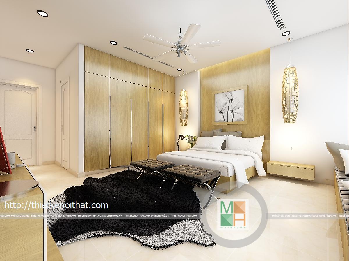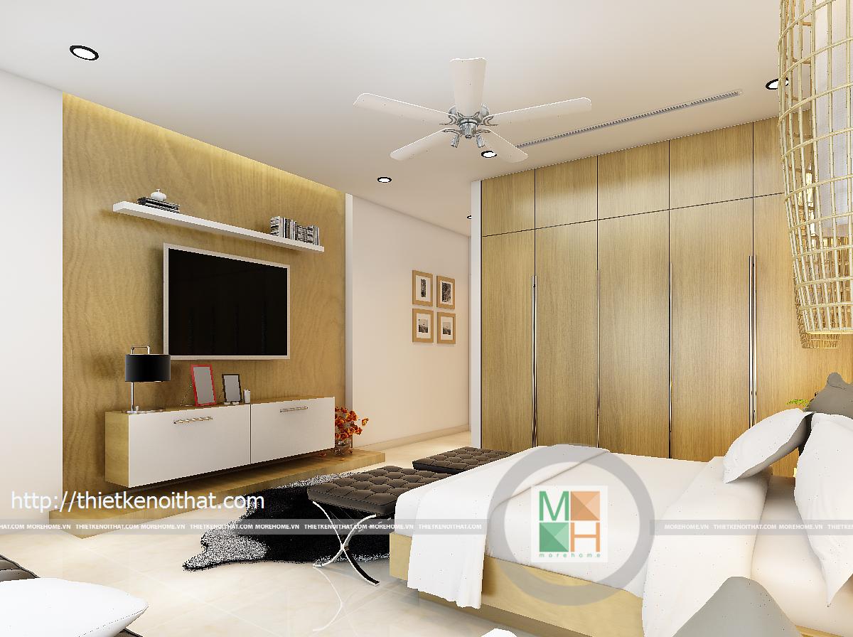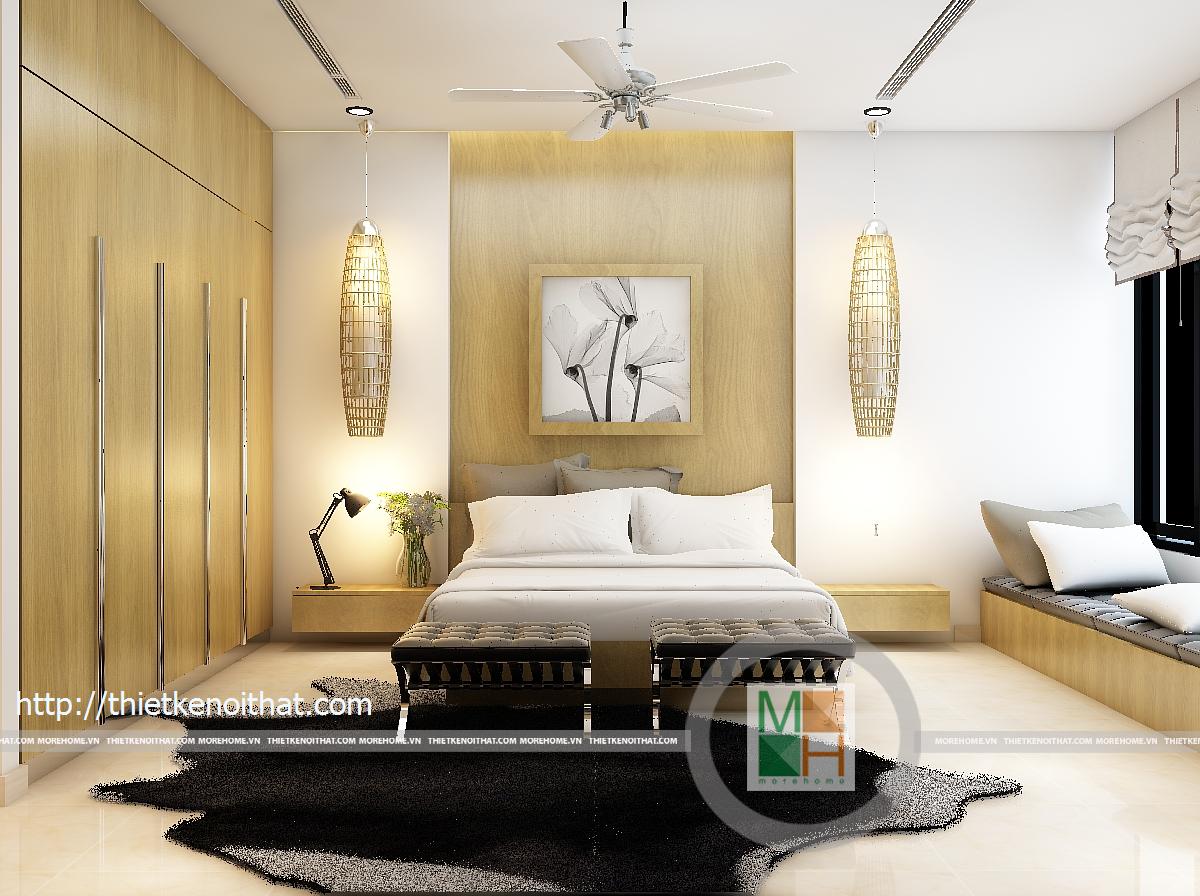 Đồ đạc trong phòng ngủ chính chủ yếu được làm từ chất liệu gỗ, đem lại cảm giác chắc chắn và thân thiện cho vợ chồng gia chủ. Mảng tường đầu giường cũng được lát gỗ, làm nổi bật bức tranh trừu tượng nền trắng treo phía trên. Đèn ngủ được thiết kế như những chiếc lồng, một kiểu trang trí rất độc đáo. Phía dưới cửa sổ kê một chiếc ghế dài để vợ chồng gia chủ có thể ngồi hoặc nằm ngả ngốn để đọc những cuốn sách hay. Tủ quần áo trong phòng được thiết kế âm tường để tiết kiệm diện tích và tăng không gian lưu trữ đồ.