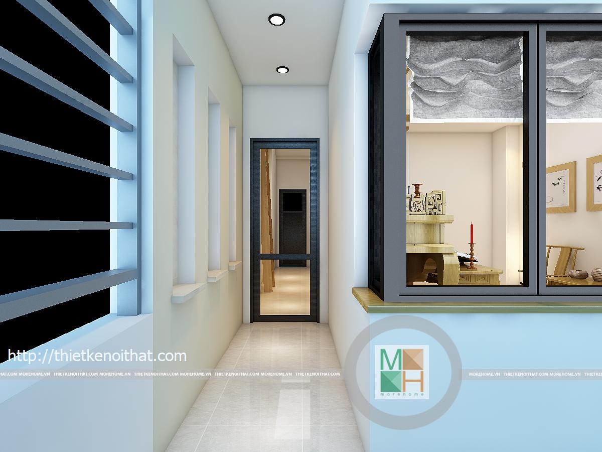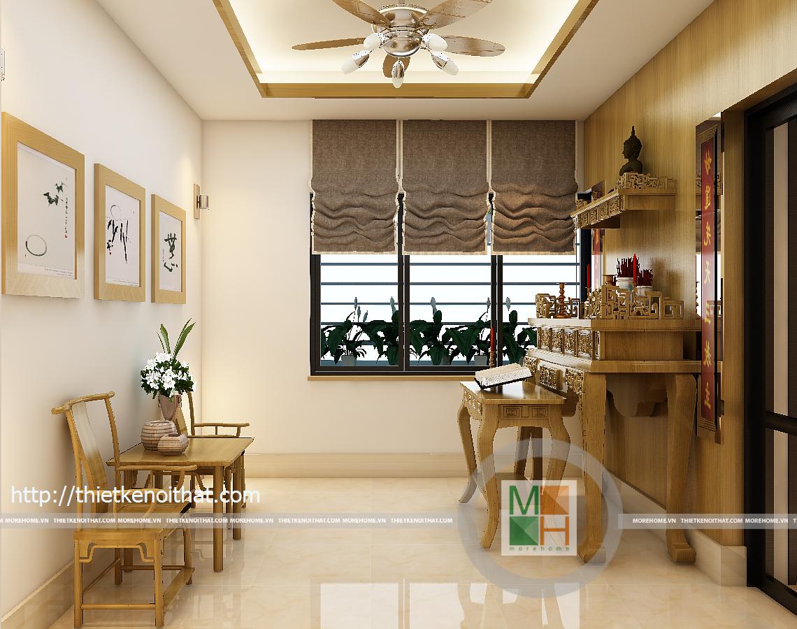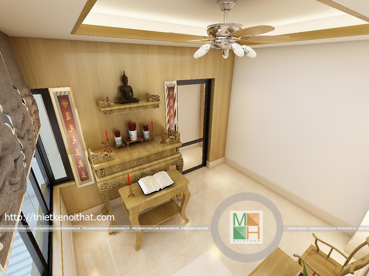 Phòng thờ được thiết kế lịch sự nhưng vẫn gây được ấn tượng với mảng tường ốp gỗ cầu kì. Bàn thờ và bàn soạn đồ được đặt ngay ngắn với những đường nét chạm trổ mang đậm chất Á đông. Hành lang bên ngoài căn phòng dẫn ra sân thượng được thiết kế đủ sáng với dãy đèn downlight hiện đại.