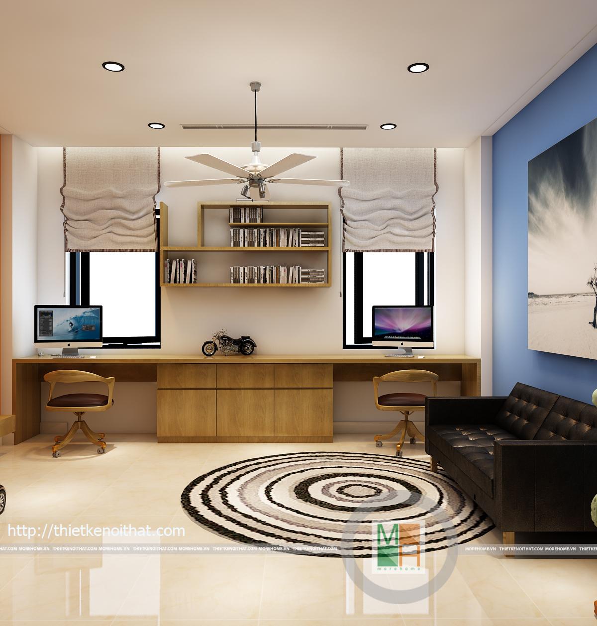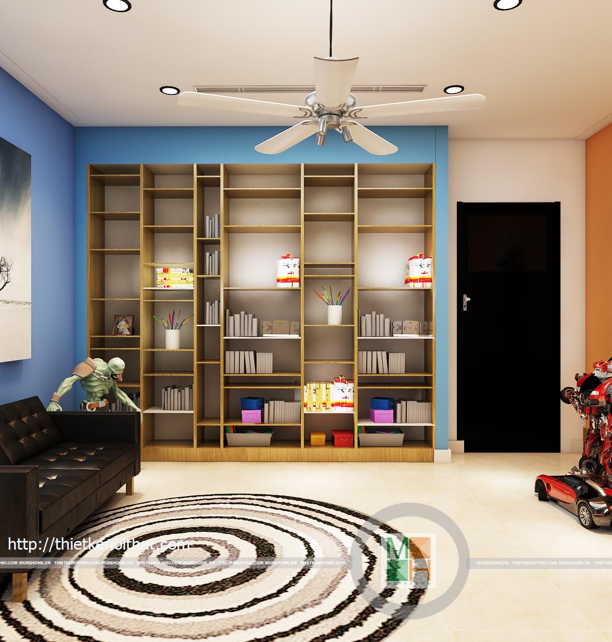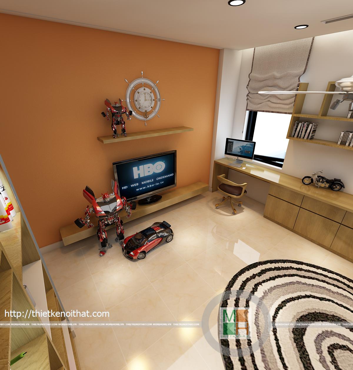Điều đặc biệt là trong căn hộ được trang bị thêm một phòng giải trí chung cho cả gia đình được sơn một phần màu xanh và cam để tạo cảm giác thư giãn nhẹ nhàng. Tủ sách cỡ lớn trong phòng giúp việc phân loại và lưu trữ sách trở nên dễ dàng hơn. Bàn đọc sách được thiết kế dài hết mảng tường, phù hơp cho hai người ngồi và dễ dàng lấy ánh sáng từ cửa sổ hắt vào. Có thể trang trí thêm cho căn phòng bằng những bức tranh hay món đồ chơi sinh động để phù hợp làm không gian chơi cho con bạn.