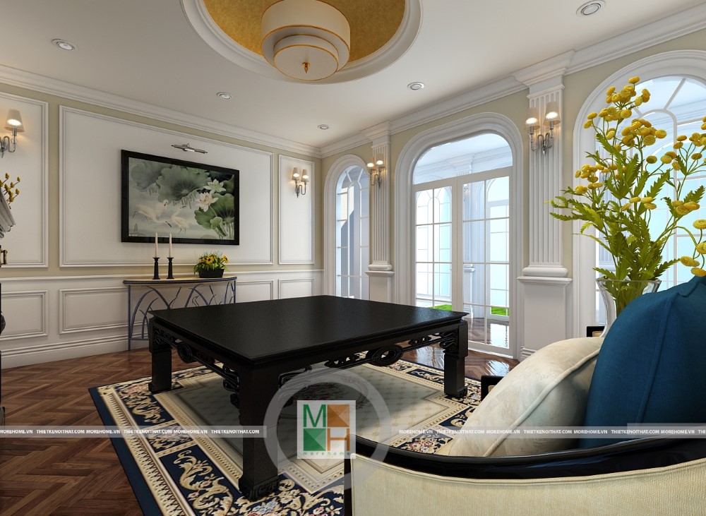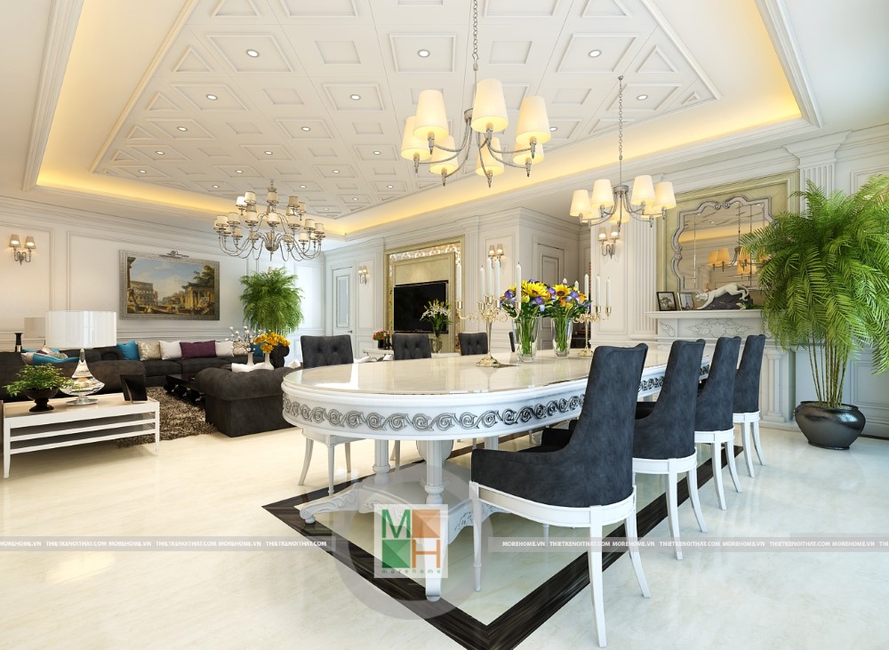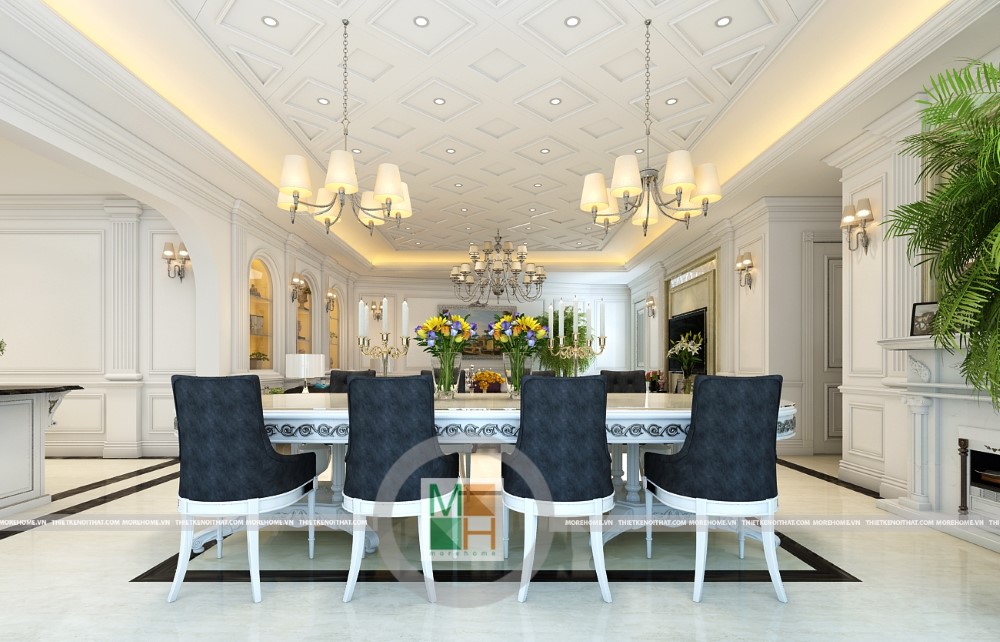 Phòng ăn được sắp xếp ngay gần phòng khách, không hề có vách ngăn cách. Bộ bàn ăn trang trọng cùng tông màu với bộ ghế sofa tạo cảm giác gần gũi và đồng bộ cho gia chủ. Trải khắp từ phòng khách đến phòng ăn chúng ta còn bắt gặp nhiều vật dụng trang trí ấn tượng mang nét đẹp của phong cách thiết kế nội thất tân cổ điển như những bức tranh, lọ hoa, hoa văn trang trí trên bàn ăn, đèn chùm… Ánh sáng cũng được các kiến trúc sư thiết kế nội thất vô cùng chú trọng. Hệ thống cửa sổ được mở rộng đón ánh sáng tự nhiên và tạo độ mở cho không gian.