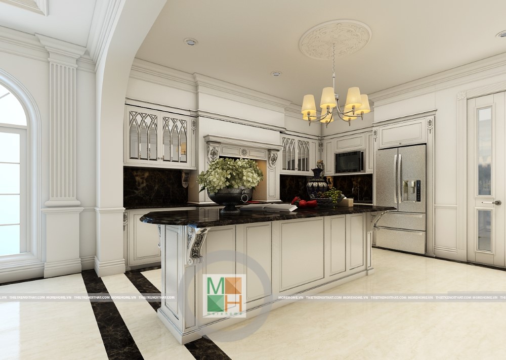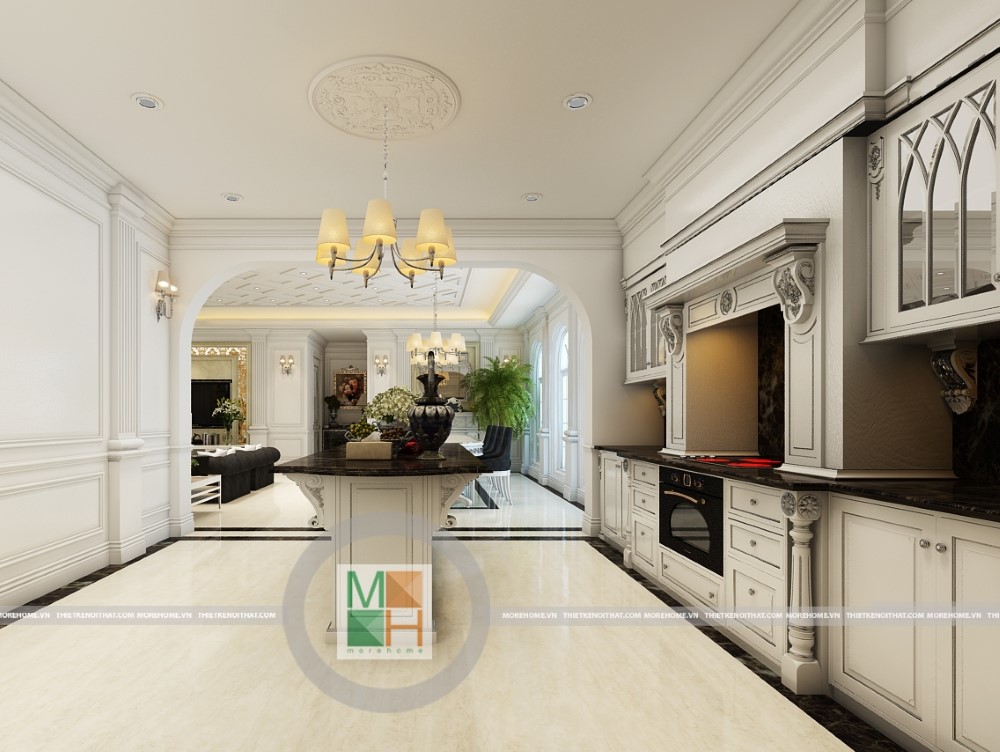 Bên cạnh không gian phòng ăn chính là khu nhà bếp. Với việc tận dụng tối đa không gian trong thiết kế nội thất, các kiến trúc sư đã khéo léo bố trí các tủ bếp ngăn nắp, mở rộng không gian sinh hoạt và tạo độ thoáng cho căn phòng. Tông màu được sử dụng chủ yếu trong thiết kế nội thất bếp là tông màu trắng, đồng nhất với phong cách thiết kế tân cổ điển đang hướng tới.