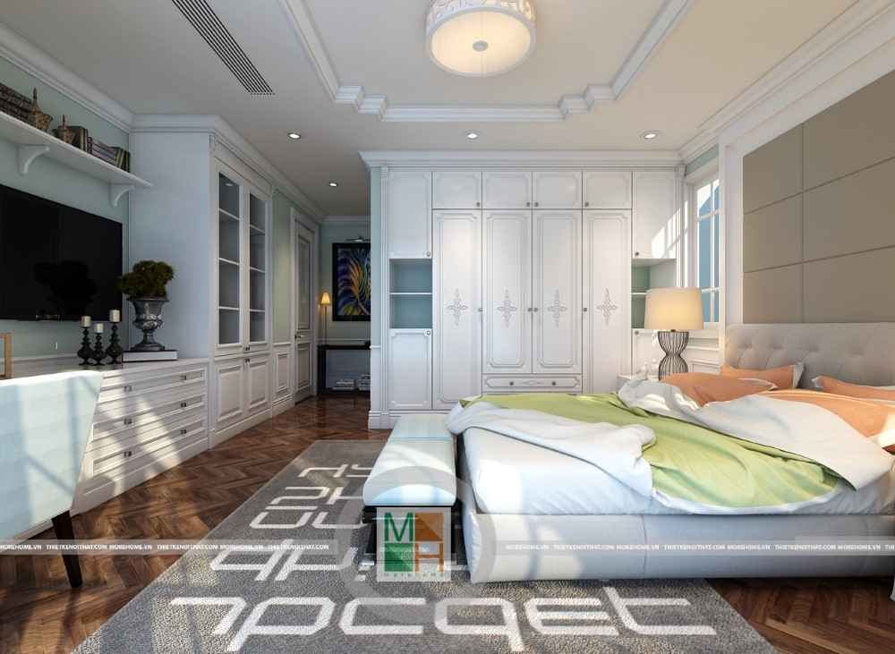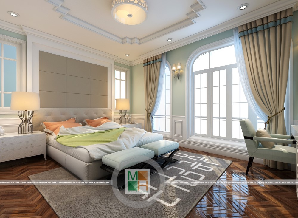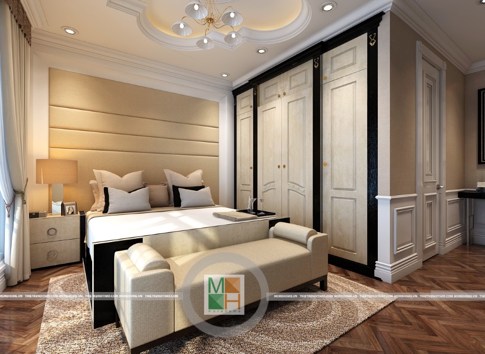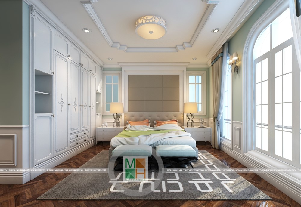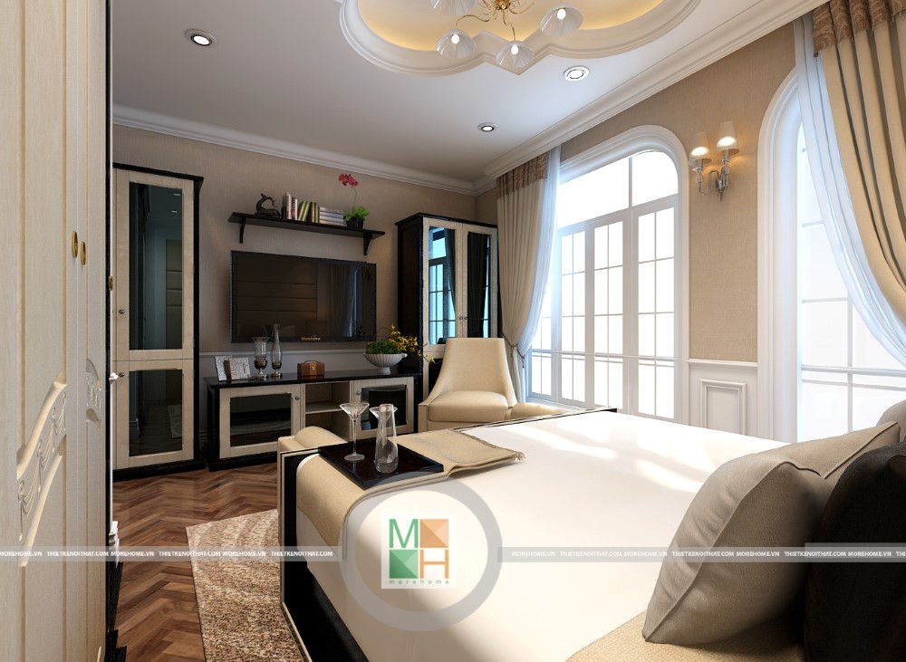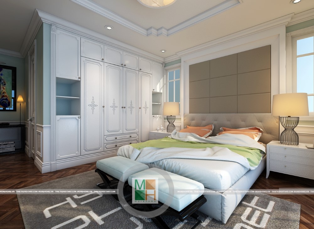 Phòng ngủ thứ ba có được thiết kế với hệ thống tủ khá nhiều, tuy vậy nhưng không hề mang đến cảm giác gò bó và hẹp về không gian thiết kế. Một bức tường được các kiến trúc sư thiết kế nội thất cách tân và sử dụng làm cửa sổ đón ánh sáng tự nhiên từ bên ngoài. Các vật dụng trang trí khác như nến, đèn ngủ, các nét trang trí nhẹ nhàng trên tủ hay thảm, rèm cũng góp phần định hình phong cách thiết kế nội thất tân cổ điển cho cả căn nhà.
