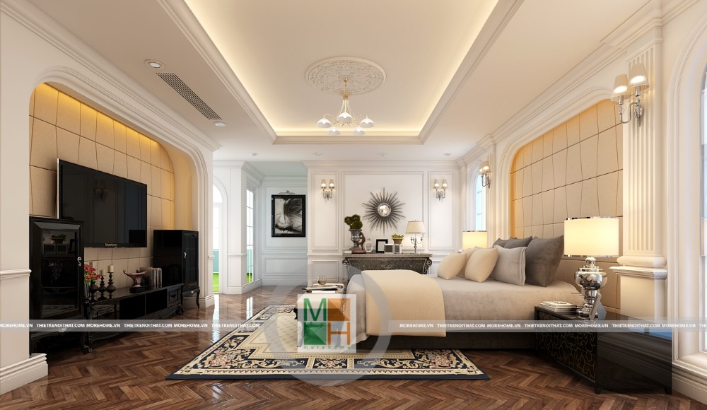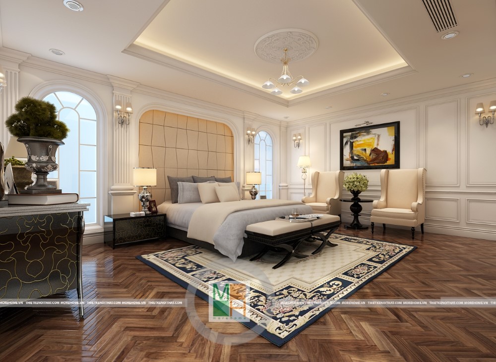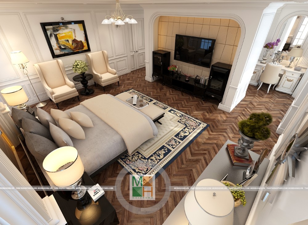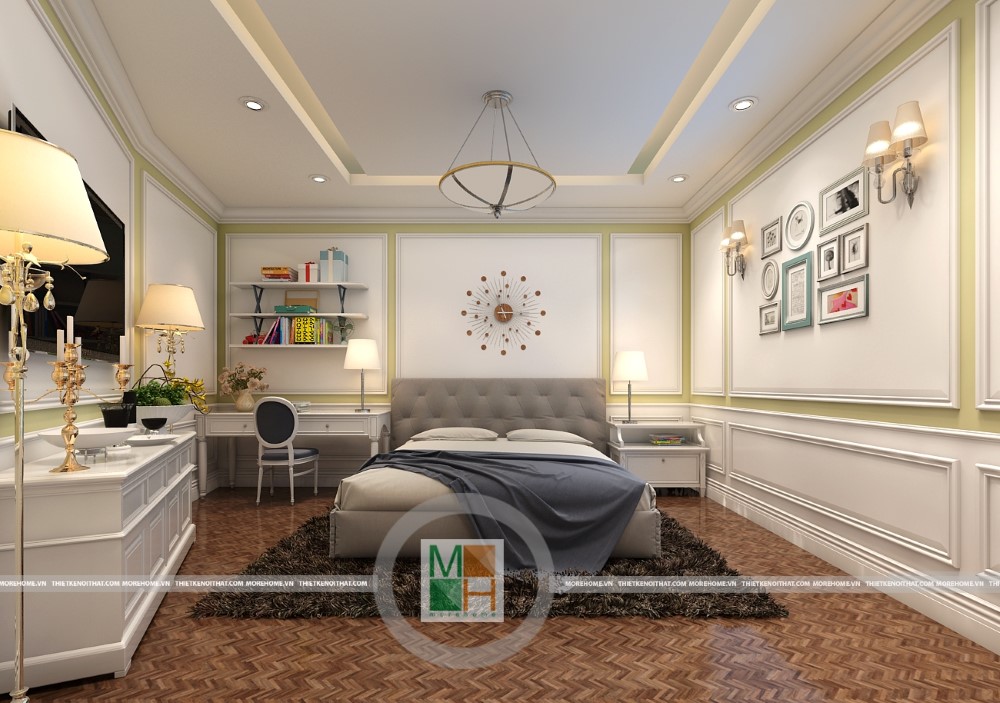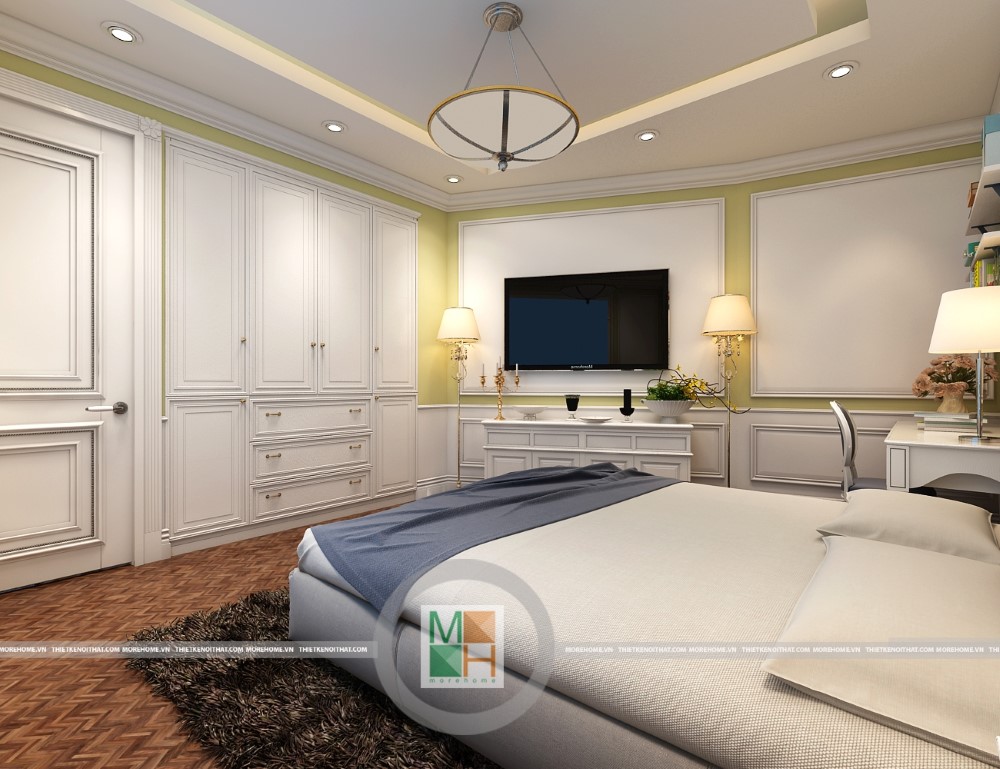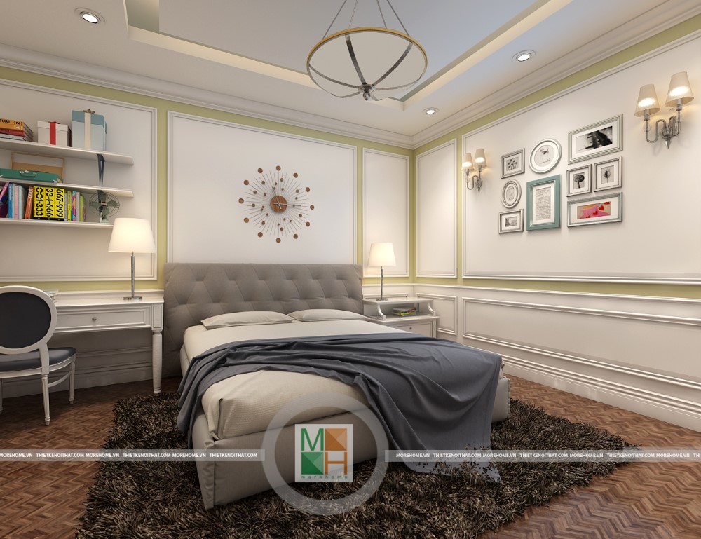 Phòng ngủ thứ ba có được thiết kế với hệ thống tủ khá nhiều, tuy vậy nhưng không hề mang đến cảm giác gò bó và hẹp về không gian thiết kế. Một bức tường được các kiến trúc sư thiết kế nội thất cách tân và sử dụng làm cửa sổ đón ánh sáng tự nhiên từ bên ngoài. Các vật dụng trang trí khác như nến, đèn ngủ, các nét trang trí nhẹ nhàng trên tủ hay thảm, rèm cũng góp phần định hình phong cách thiết kế nội thất tân cổ điển cho cả căn nhà.
