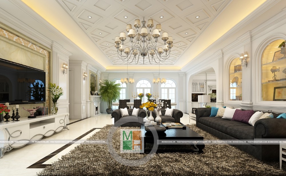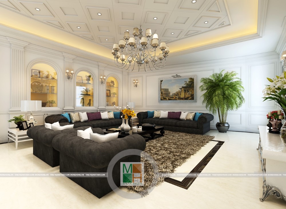 Phòng khách với thiết kế mở rộng, hệ thống đèn được bố trí đối xứng có chủ ý tạo một không gian sang trọng và thu hút. Bộ sofa theo tông màu tối trầm với các chi tiết trang trí điểm xuyết màu sắc từ những chiếc gối tạo sự hài hòa và ăn nhập với phong cách mà các kiến trúc sư thiết kế nội thất đang hướng tới. Đặc biệt không gian kiến trúc xanh cũng được tác giả chú trọng khi tạo điểm nhấn là chậu cây cảnh trong phòng khách. Một điểm đặc biệt không thể bỏ qua ở đây chính là nơi đặt tivi, với thiết kế bắt mắt, đường nét trang trí mang đậm tính cổ điển và quý phái.