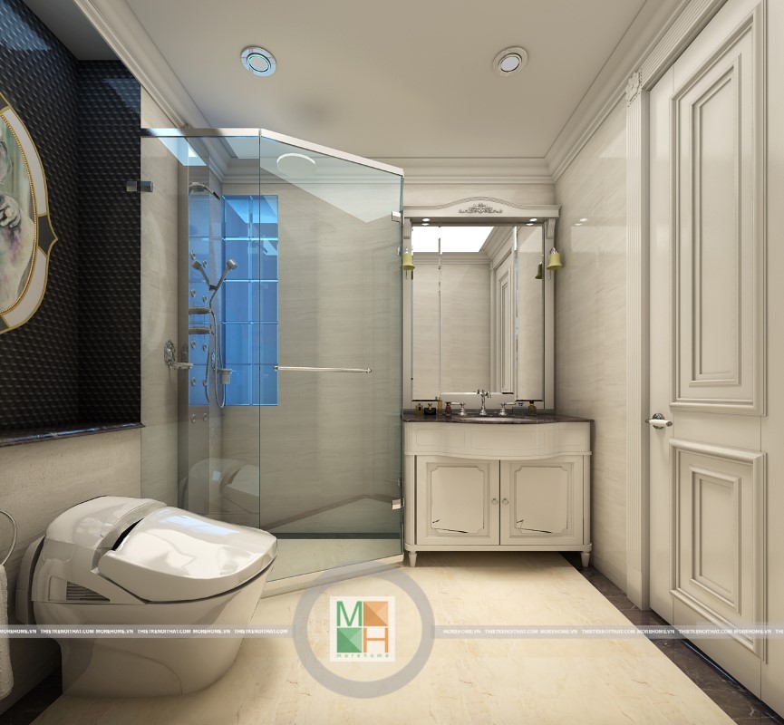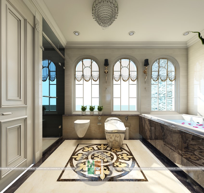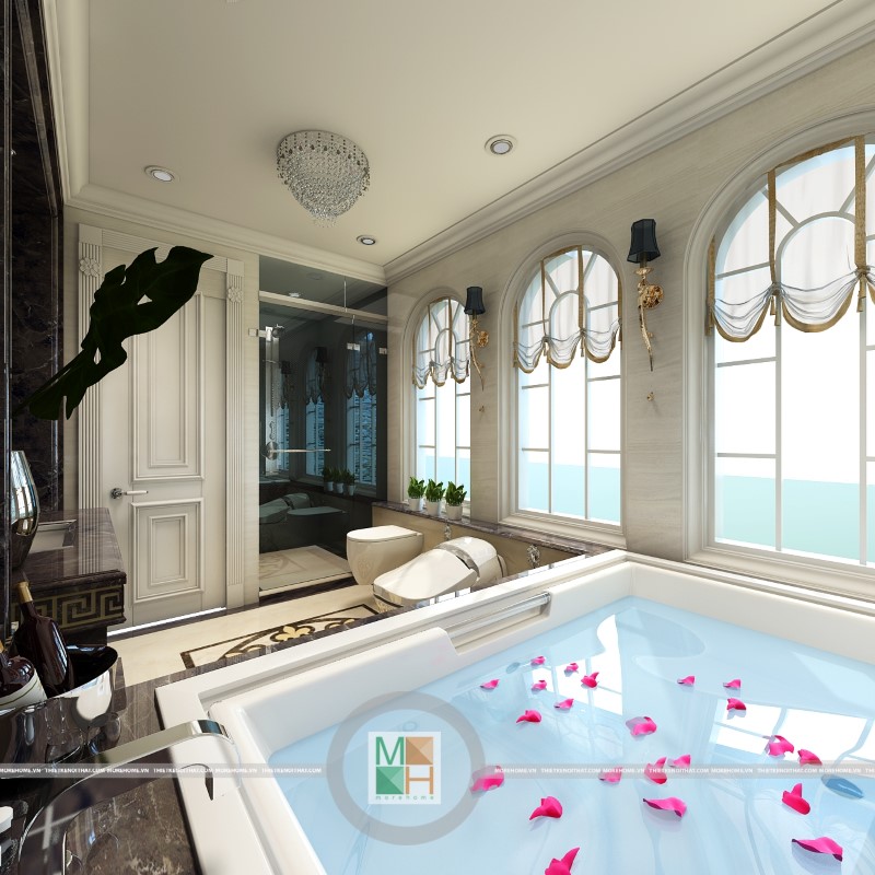 Phòng tắm là nơi mà có lẽ sẽ đem đến ấn tượng sâu sắc nhất trong tổng thể cả căn nhà. Ánh sáng tự nhiên được tận dụng tối đa từ hệ thống cửa sổ trải dài. Các thiết kế nội thất khác với phong cách tân cổ điển thực sự gây ấn tượng mạnh mang lại cảm giác sang trọng và tiện nghi cho gia chủ. Không gian xanh cũng được các kiến trúc sư thiết kế nội thất vô cùng chú trọng với việc sắp đặt có chủ ý các lọ hoa, cây xanh trong phòng. Các chi tiết khác như gạch lát sàn, hoa văn trang trí trên tường cũng góp phần lớn định hình phong cách tân cổ điển cho căn phòng.