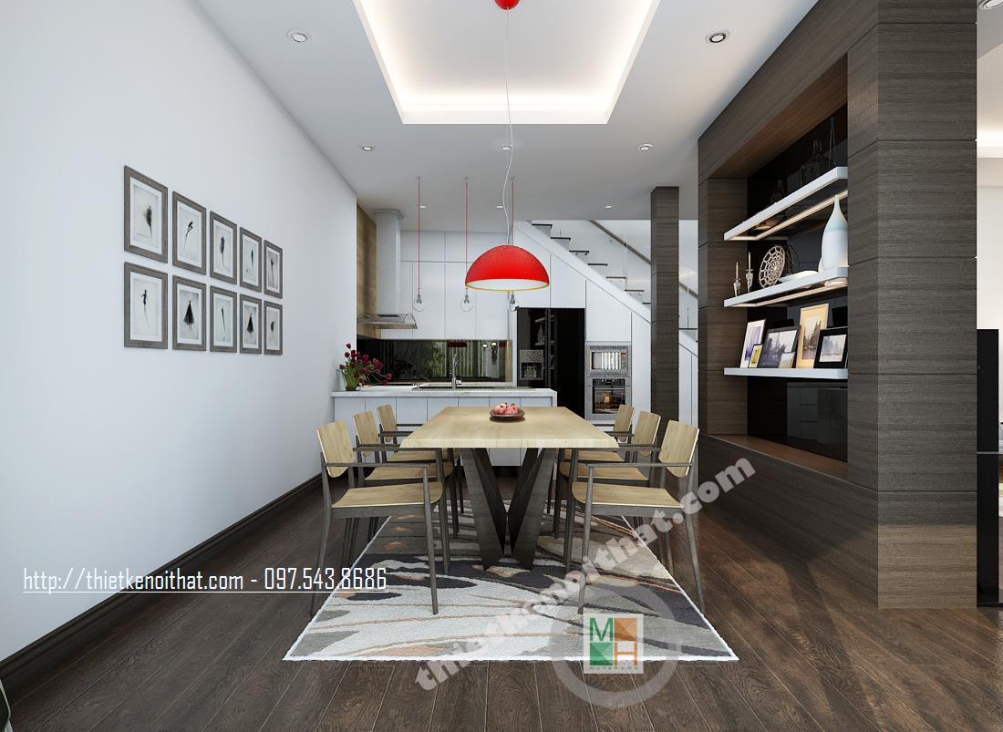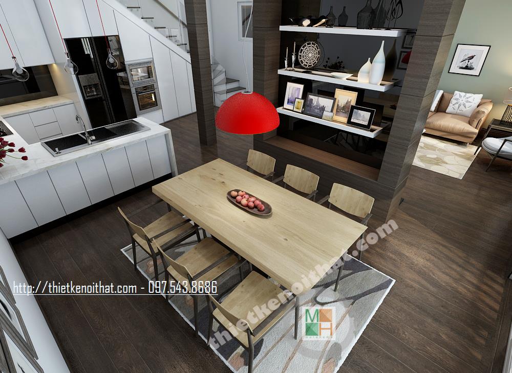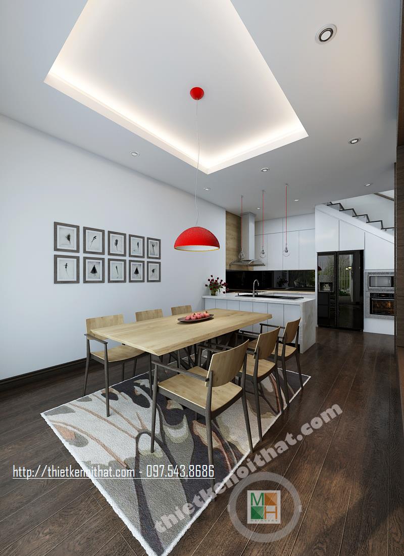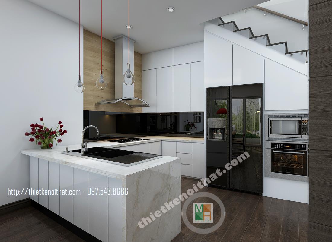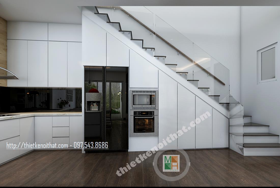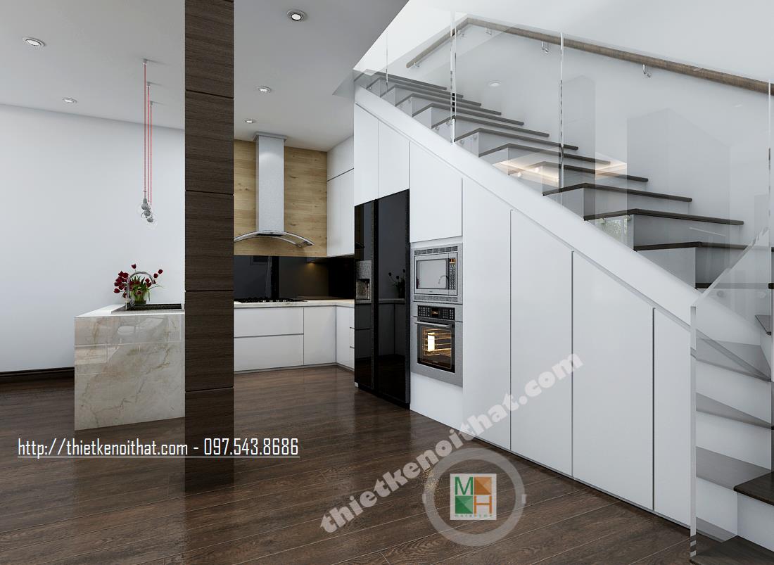 Thiết kế nội thất phòng bếp và bàn ăn liền kề, không hề có vách ngăn tiết kiệm không gian sinh hoạt chung cho gia đình. Hệ thống tủ bếp được sắp xếp khéo léo ngay dưới gầm cầu thang là ý tưởng không tồi cho một khu bếp tiện lợi, trang nhã.