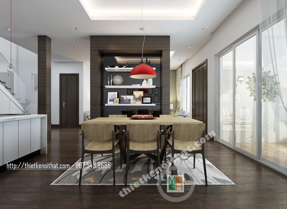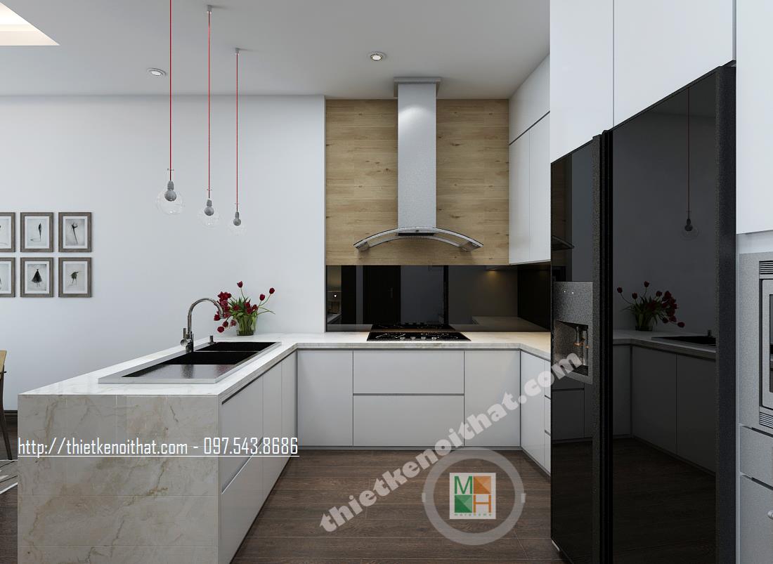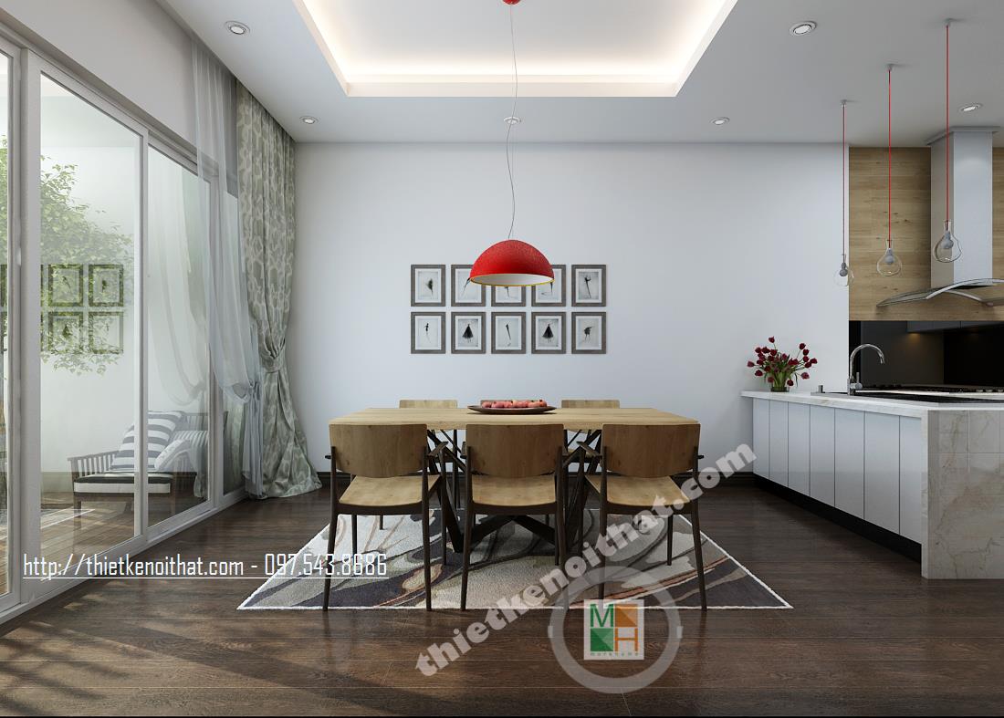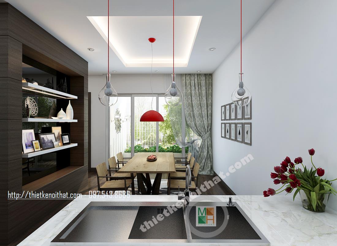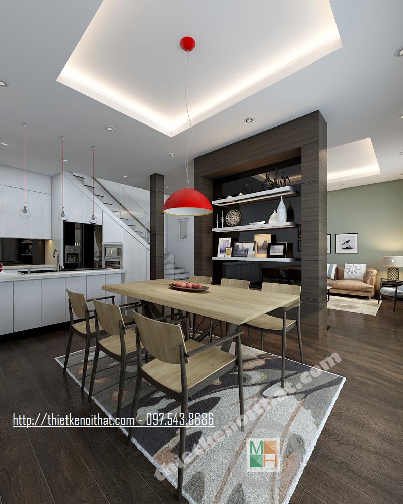 Thiết kế nội thất phòng bếp và bàn ăn liền kề, không hề có vách ngăn tiết kiệm không gian sinh hoạt chung cho gia đình. Hệ thống tủ bếp được sắp xếp khéo léo ngay dưới gầm cầu thang là ý tưởng không tồi cho một khu bếp tiện lợi, trang nhã.