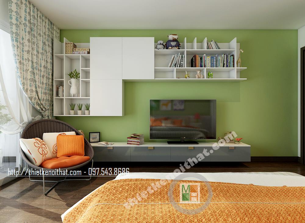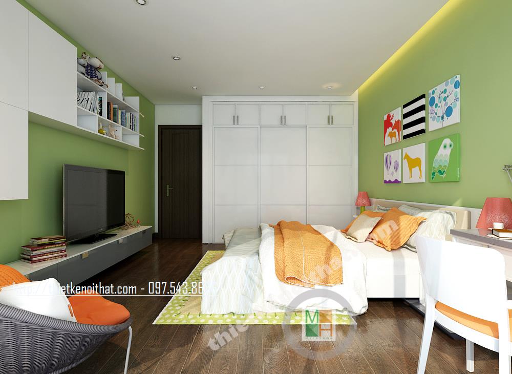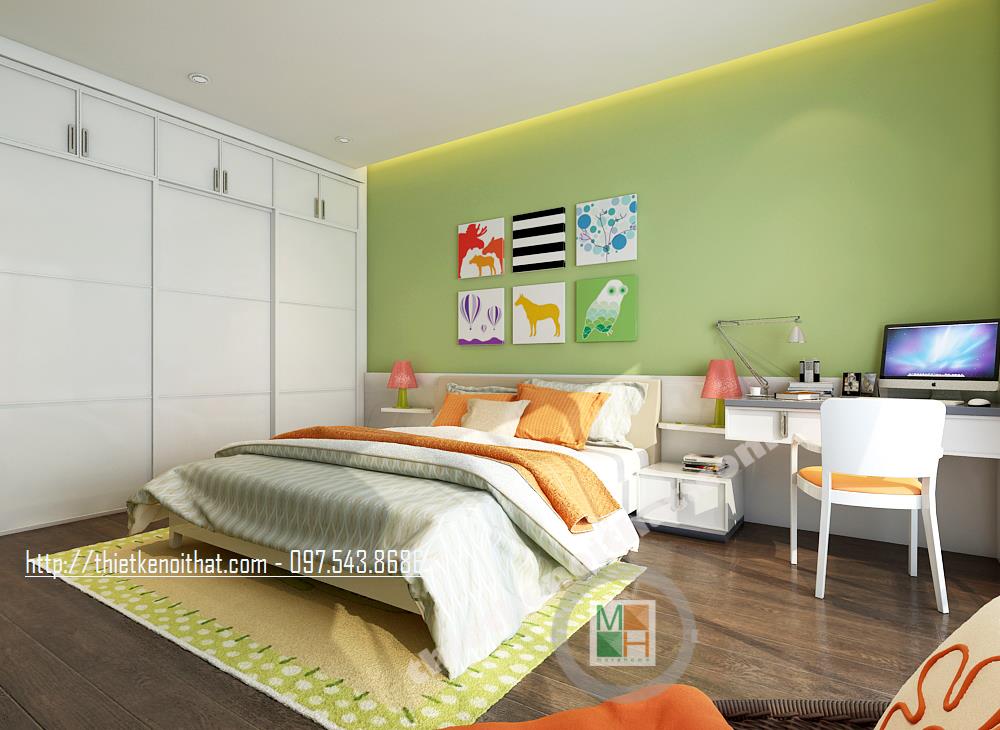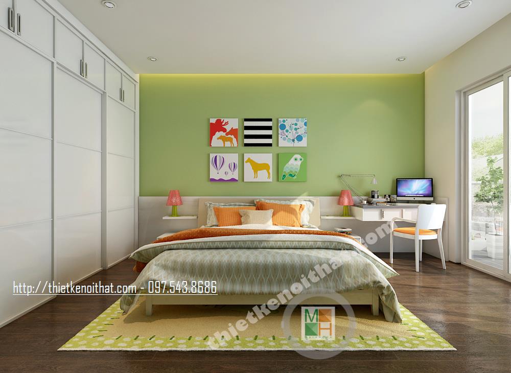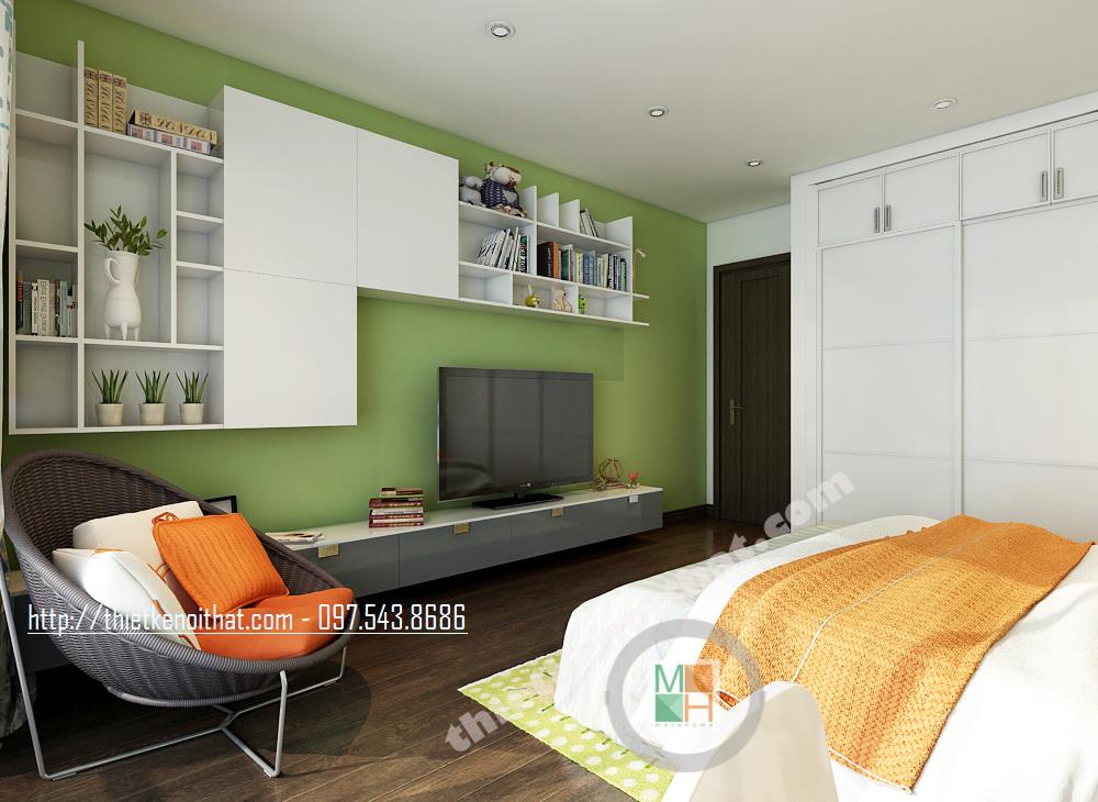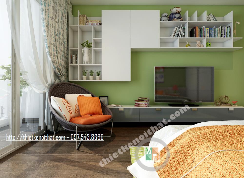 Thiết kế phòng ngủ đầy màu sắc trẻ trung và năng động. Không gian mở rộng hướng ra khung cửa với view rộng mang ánh sáng tự nhiên vào căn phòng. Sắc xanh dịu mắt được sử dụng mang lại cảm giác thân thiện cho căn phòng. Thiết kế không gian nội thất tối giản hóa với tủ quần áo gần như đồng nhất với tường tạo khoảng lớn cho không gian sinh hoạt cá nhân. Khung kệ tủ sách được thiết kế độc đáo và tiện lợi, sắp xếp gọn gàng một góc tường tận dụng được tối đa không gian mà không làm mất đi tính thẩm mỹ của căn phòng.