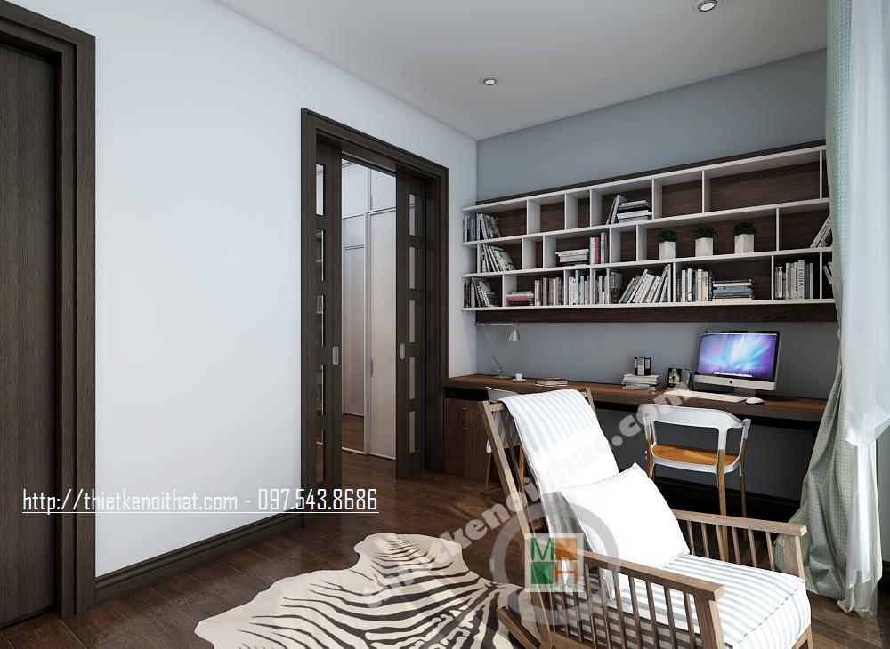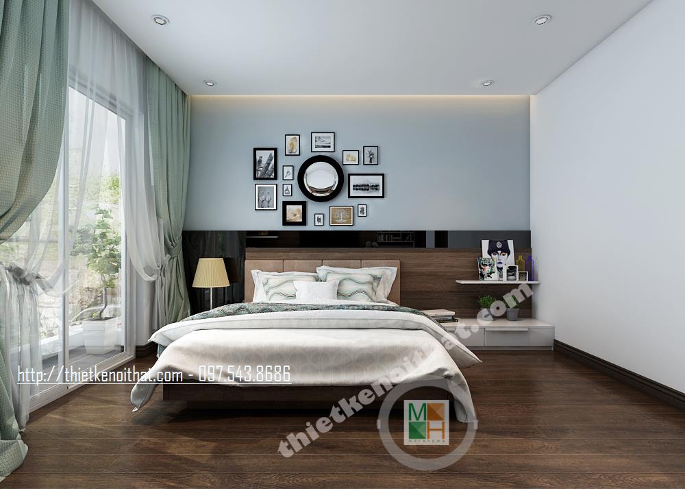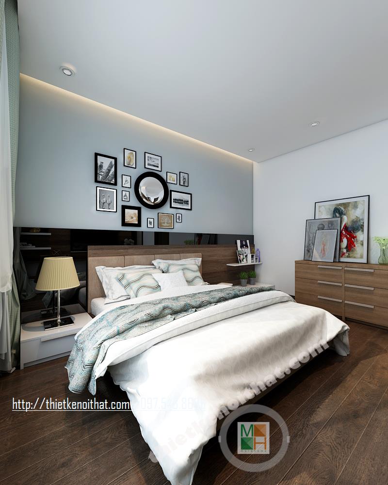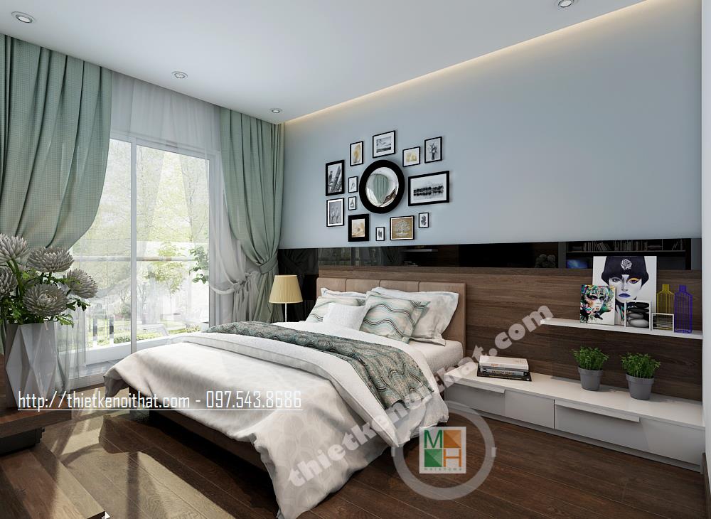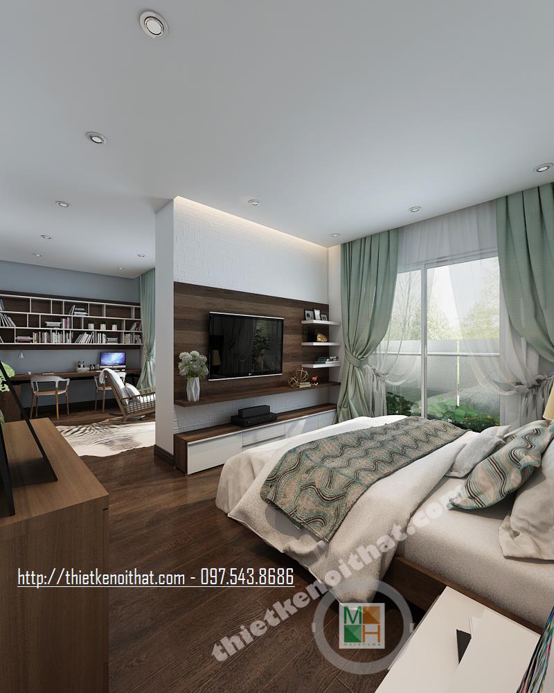 Thiết kế phòng ngủ đầy màu sắc trẻ trung và năng động. Không gian mở rộng hướng ra khung cửa với view rộng mang ánh sáng tự nhiên vào căn phòng. Sắc xanh dịu mắt được sử dụng mang lại cảm giác thân thiện cho căn phòng. Thiết kế không gian nội thất tối giản hóa với tủ quần áo gần như đồng nhất với tường tạo khoảng lớn cho không gian sinh hoạt cá nhân. Khung kệ tủ sách được thiết kế độc đáo và tiện lợi, sắp xếp gọn gàng một góc tường tận dụng được tối đa không gian mà không làm mất đi tính thẩm mỹ của căn phòng.