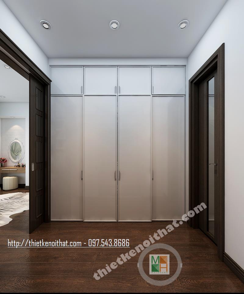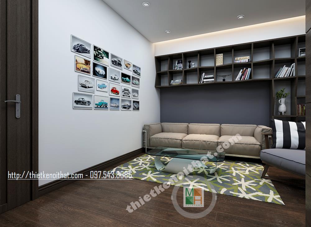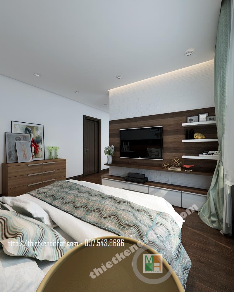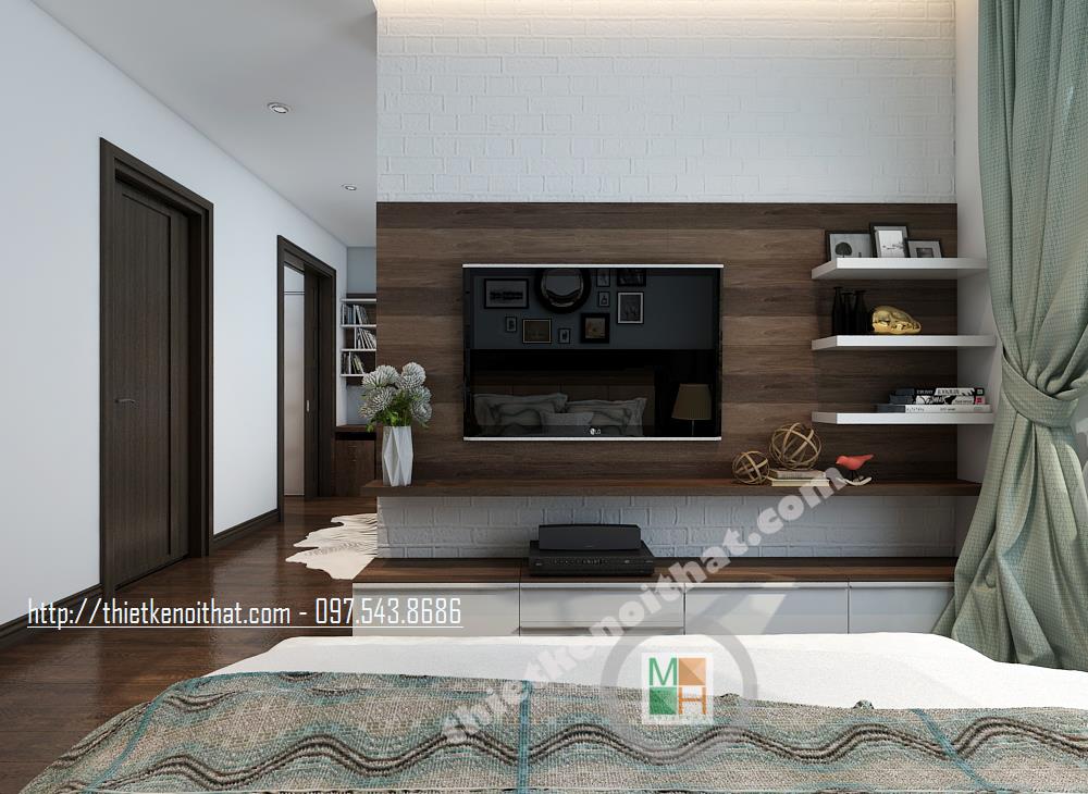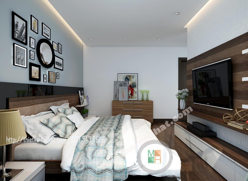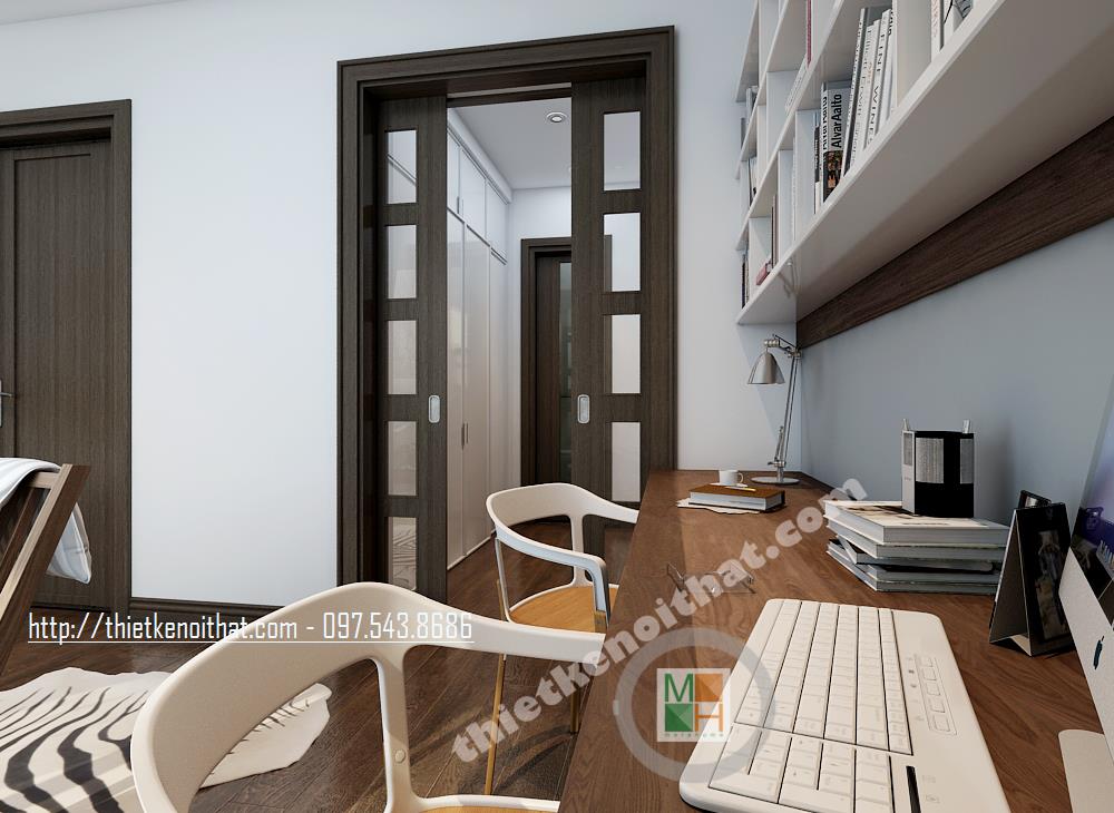 Thiết kế phòng ngủ đầy màu sắc trẻ trung và năng động. Không gian mở rộng hướng ra khung cửa với view rộng mang ánh sáng tự nhiên vào căn phòng. Sắc xanh dịu mắt được sử dụng mang lại cảm giác thân thiện cho căn phòng. Thiết kế không gian nội thất tối giản hóa với tủ quần áo gần như đồng nhất với tường tạo khoảng lớn cho không gian sinh hoạt cá nhân. Khung kệ tủ sách được thiết kế độc đáo và tiện lợi, sắp xếp gọn gàng một góc tường tận dụng được tối đa không gian mà không làm mất đi tính thẩm mỹ của căn phòng.