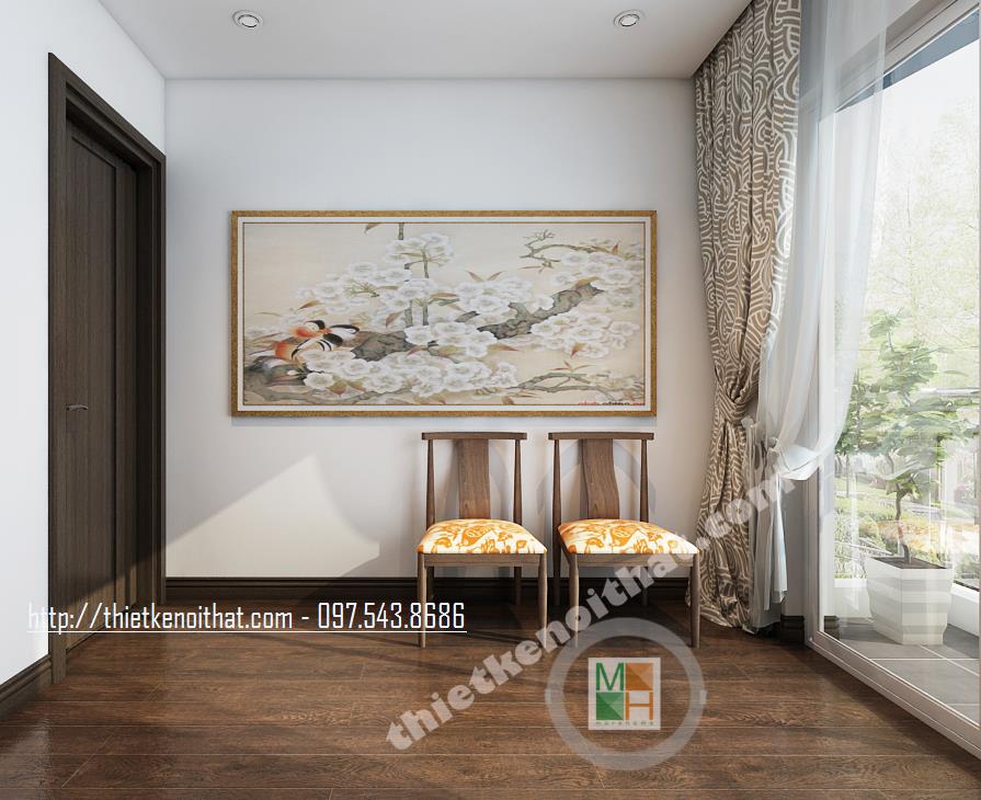 Không gian phòng ngủ Master với thiết kế đơn giản. Một vài điểm nhất trang trí như tranh ảnh, đường nét được điểm xuyết trong căn phòng. Điểm thu hút nhất có lẽ là bố cục hai trong một được kiến trúc sư khéo léo sắp đặt chỉ bằng một bức tường nhỏ ngăn cách. Không gian mở ra không chỉ là phòng ngủ mà còn là phòng đọc và làm việc view rộng mang đến sự nghỉ ngơi thư thái cho gia chủ.