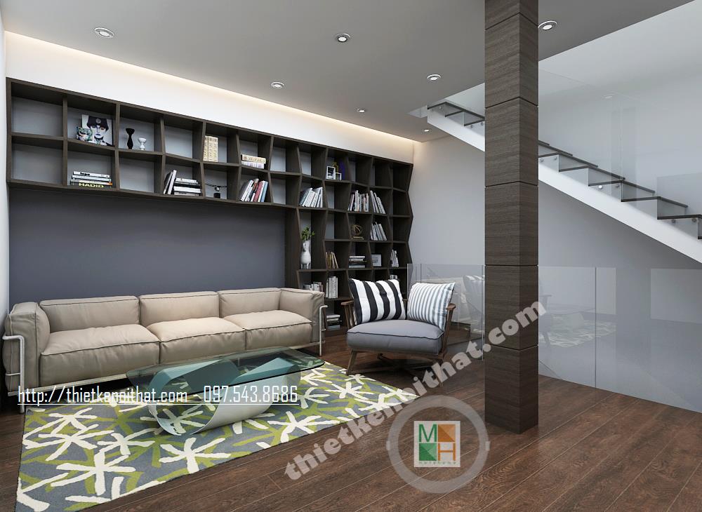 Cầu thang dẫn xuống một căn phòng nhỏ, là không gian sinh hoạt chung thứ hai cho cả gia đình. Thiết kế không gian hợp lý với hệ thống tủ gỗ trang trí lạ mắt, ấn tượng.