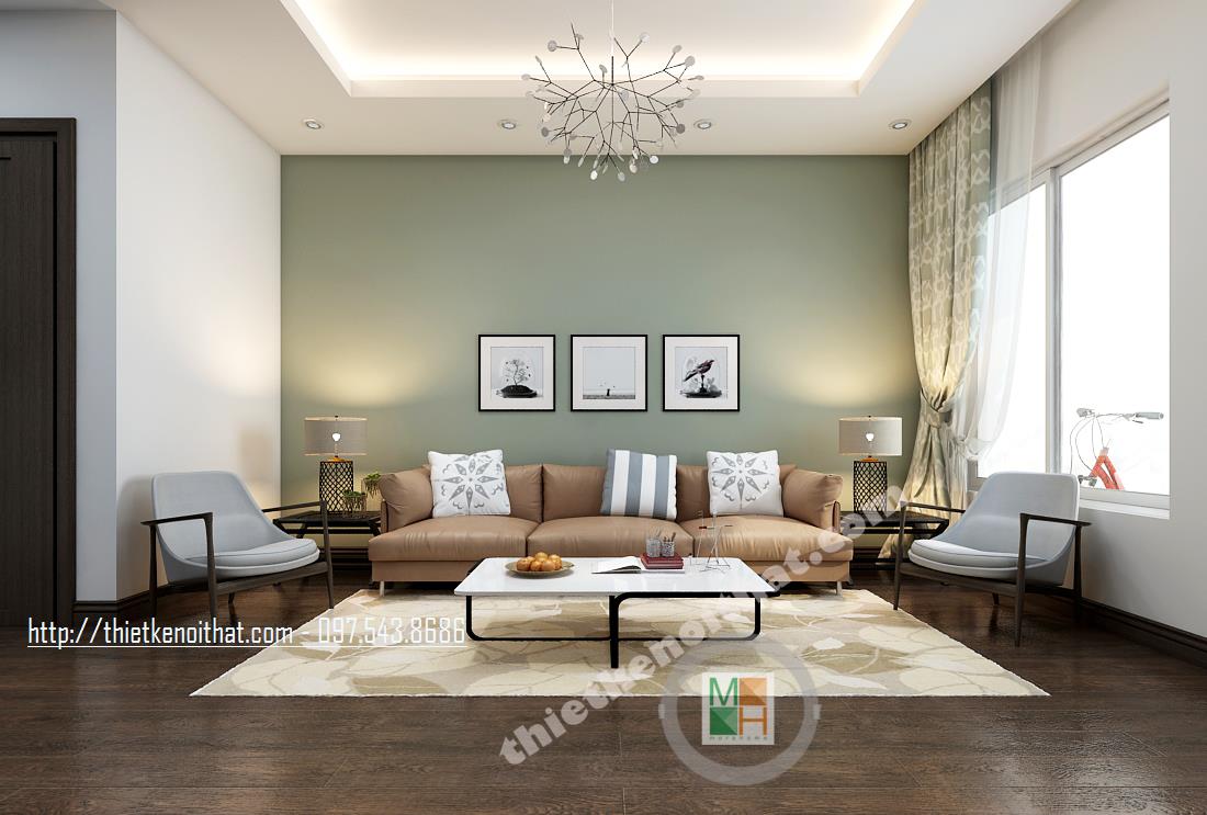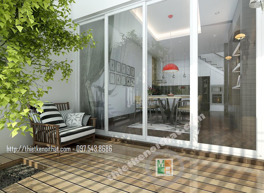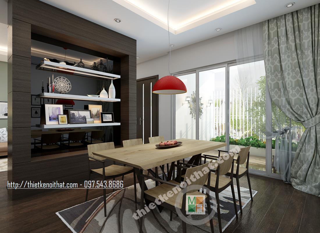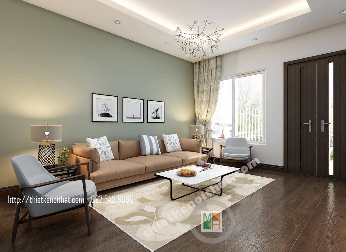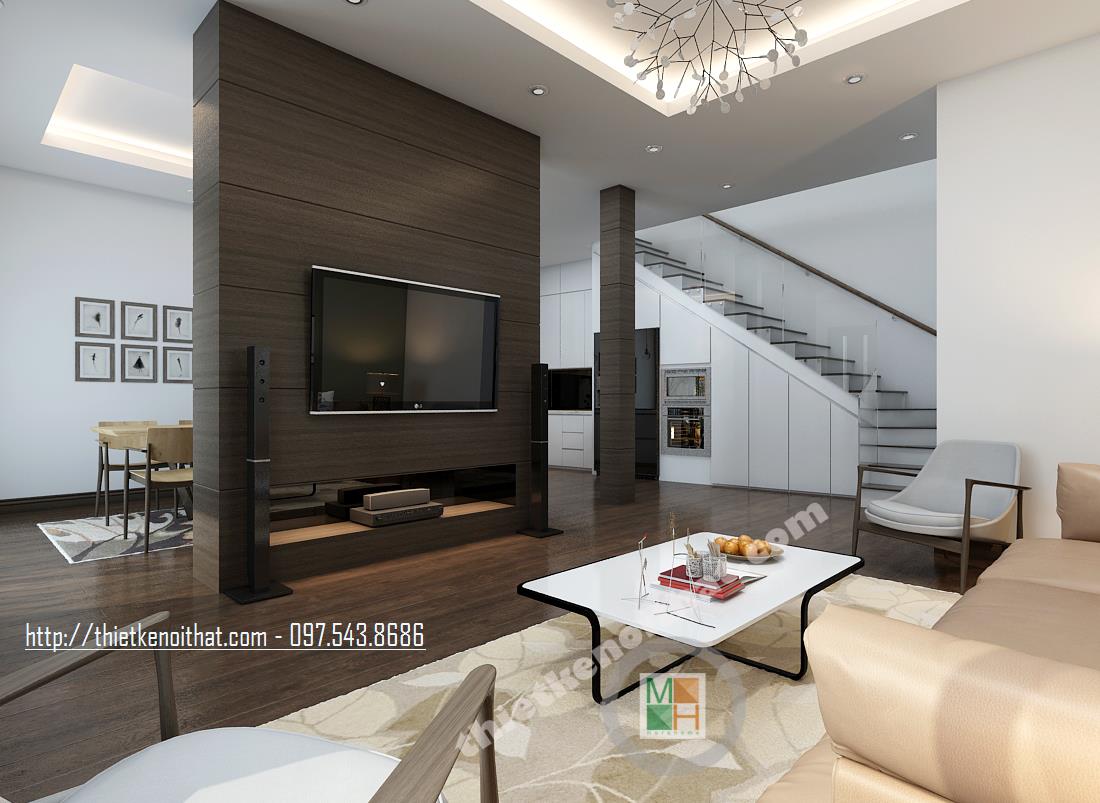 Căn nhà được thiết kế với tông màu trắng làm nền. Thiết kế phòng khách mộc mạc với sự kết hợp hài hòa của ánh sáng và màu sắc. Một bức tường được sơn xanh lạ mắt giúp căn phòng bớt nhàm chán và đơn điệu. Một điểm đặc biệt thu hút của căn phòng có lẽ là bức tường ngăn phòng khách và khu bàn ăn. Thay vì các yếu tố built-in cứng nhắc và thô kệch thì kiến trúc sư đã sử dụng tủ tường ngăn giả gỗ khéo léo kết hợp với tủ đồ, vừa đảm bảo tính thẩm mỹ vừa mang đến sự tiện lợi cho gia chủ. Không gian bàn ăn được mở rộng khá nhiều so với thiết kế ban đầu, bên cạnh đó hệ thống khung cửa mở rộng mang ánh sáng tự nhiên vào căn phòng tạo hiệu ứng mở rộng không gian cho căn nhà.