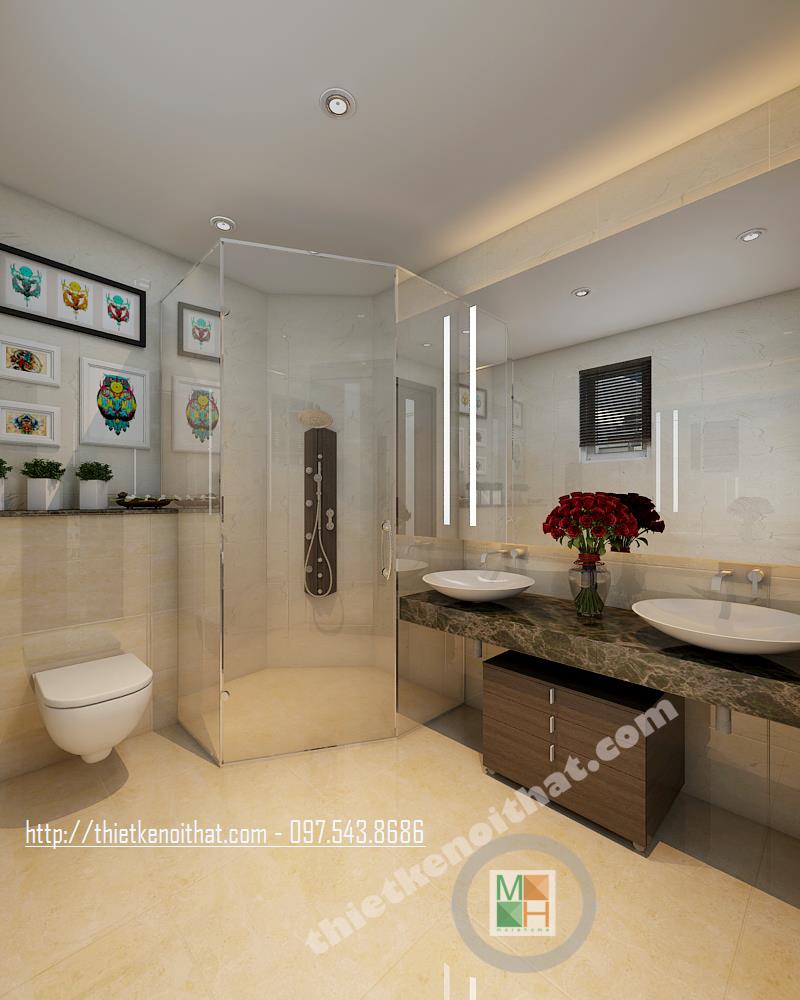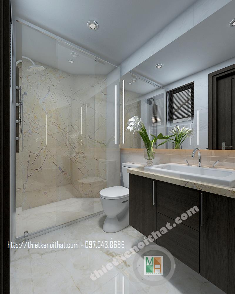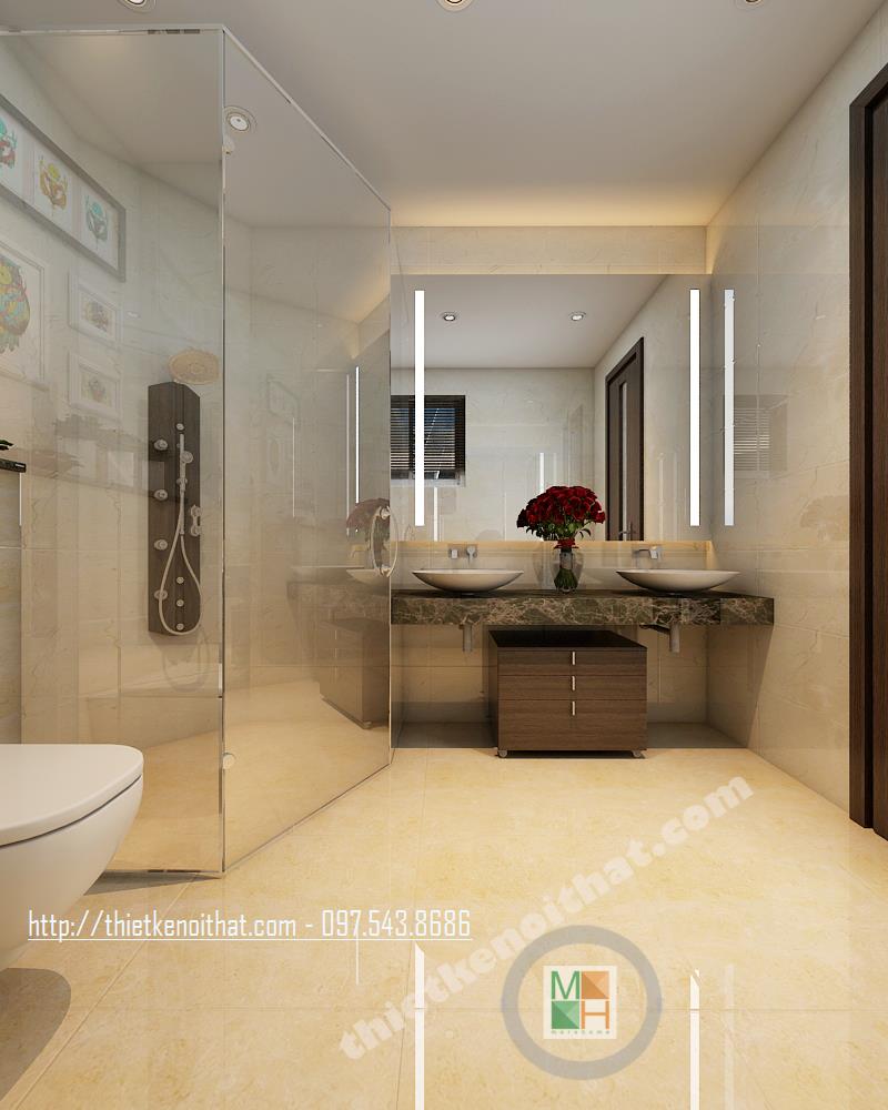 Phòng tắm được thiết kế rộng rãi và sang trọng. Các vật liệu nhẹ như kính, gỗ và gương được sử dụng đồng bộ tạo hiệu ứng tương phản giúp mang lại cảm giác mở rộng không gian.