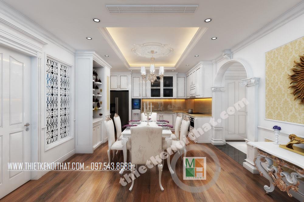 Thiết kế phòng bếp sử dụng tông màu trắng trang nhã mang lại cảm giác nhẹ nhàng và tinh tế cho gia chủ. Hệ thống tủ bếp hay tủ rượu được thiết kế tinh xảo và đẹp mắt thu hút sự chú ý và tạo điểm nhấn cho căn phòng. Tuy diện tích mặt bằng chung của khu bếp không quá rộng nhưng các hiệu ứng về màu sắc và chất liệu nhẹ như gỗ đã làm cho không gian trở nên mở và thoáng hơn nhiều.