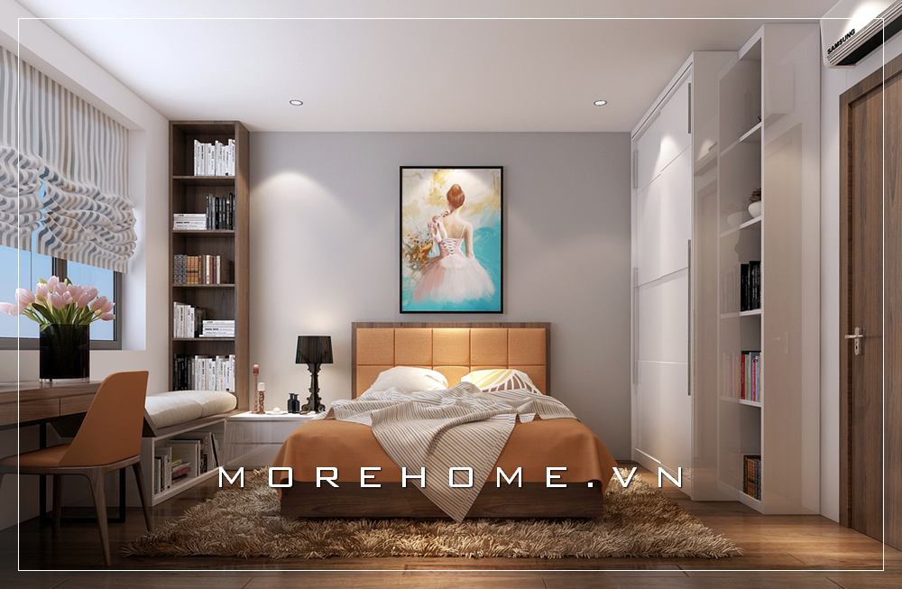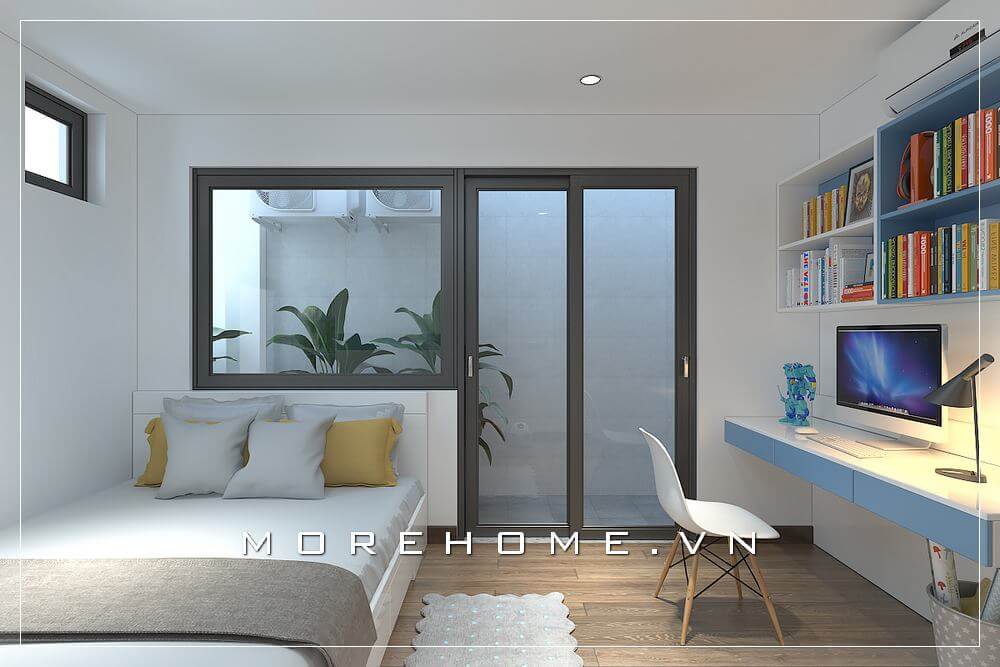 Thiết kế giường ngủ con trai phong cách hiện đại, trẻ trung, ở không gian này, KTS cũng lựa chọn tone màu trắng chủ đạo mang lại cho khu vực phòng ngủ thêm cơi nới, rộng rãi hơn