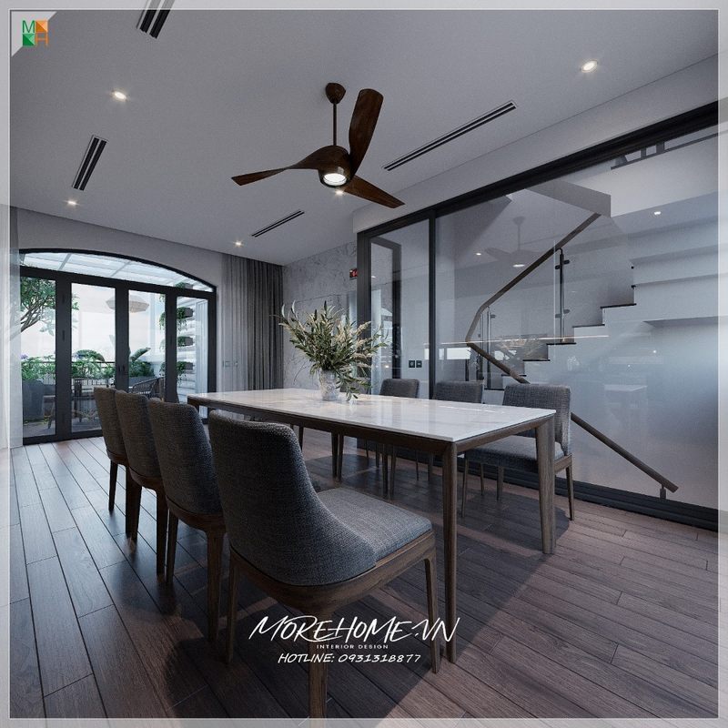 Vách ngăn kính giữa phòng ăn và lối đi cầu thang bộ giúp mở rộng không gian diện tích, tạo cảm giác thoải mái và tránh cảm giác bí bách trật hẹp.