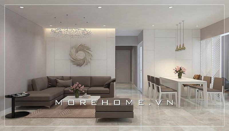 Mẫu thiết kế nội thất chung cư đẹp, tiện nghi với tông màu chủ đạo là trắng và được ghi xẫm.